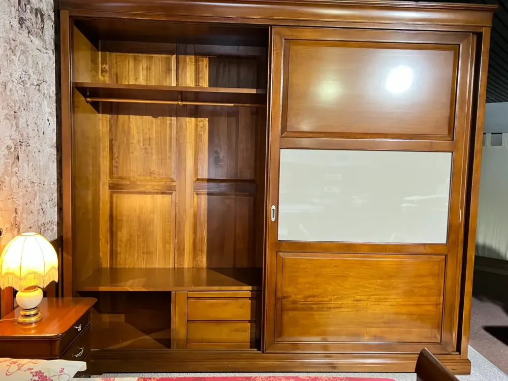 Composizione completa di armadio scorrevole con attrezzatura interna, letto, comò, coppia comodini e specchiera, tutto completamente in legno colore Noce.