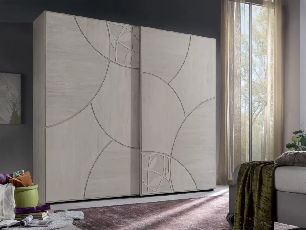 camera da letto in legno massello impreziosita dal particolare decoro laser , con linee sobrie ed eleganti.