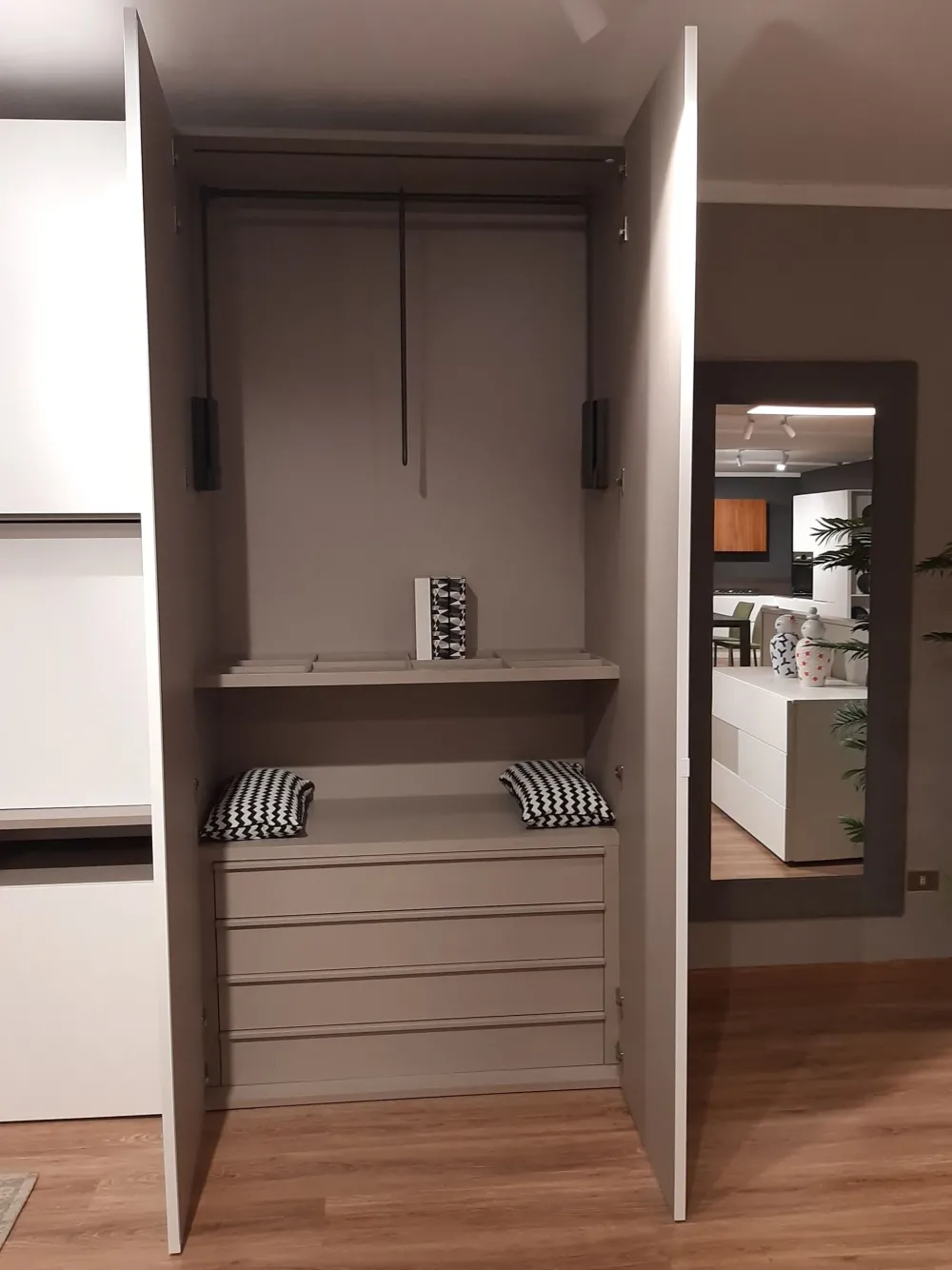 Armadio mod. Barret ad anta battente con maniglia integrata e finitura interna effetto tessuto leather grey, composizione da L 363 cm H 258 cm P 62 cm, suddiviso in tre moduli da 120 cm con vano TV centrale apribile (misura max TV 40 pollici) e dotazione interna con cassettiera 4 cassetti da 120 cm , vassoio porta cinture e servetto sali-scendi, n. 4 ripiani da 120 cm, porta pantaloni e luce a led interna con sensore.