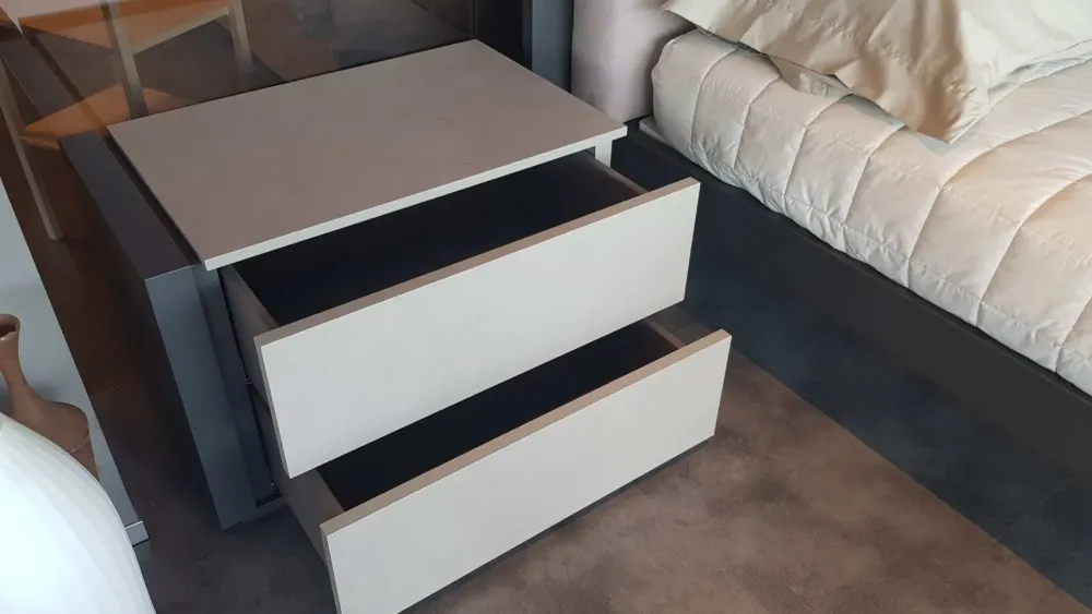 I due comodini riprendono le finiture dell’armadio e del letto e sono caratterizzati da n.2 cassetti con guide a rientro ammortizzato, misurano cm. 67x41prof.x44h.