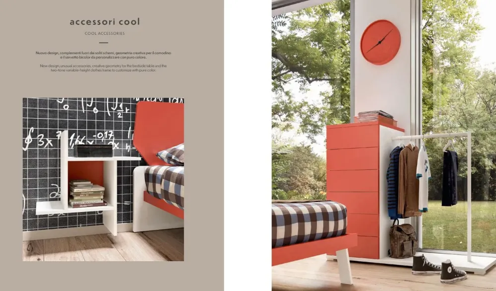 Camera Mottes Mobili Letto singolo con particolare comodino, cassettiera a 6 cassetti, scrivania con pensili a giorno e mobile a terra a due cassettoni. Armadiatura a 4 ante battenti. Nuovo design, complementi fuori dai soliti schemi, geometria creativa per il comodino e il servetto bicolor da personalizzare con puro colore. I tempi di consegna sono di circa 50//60 giorni lavorativi Il prezzo è di 2800 euro iva e consegna compresa. Si possono modificare i colori senza variazione di prezzo! Per qualsiasi informazione contattateci in privato!