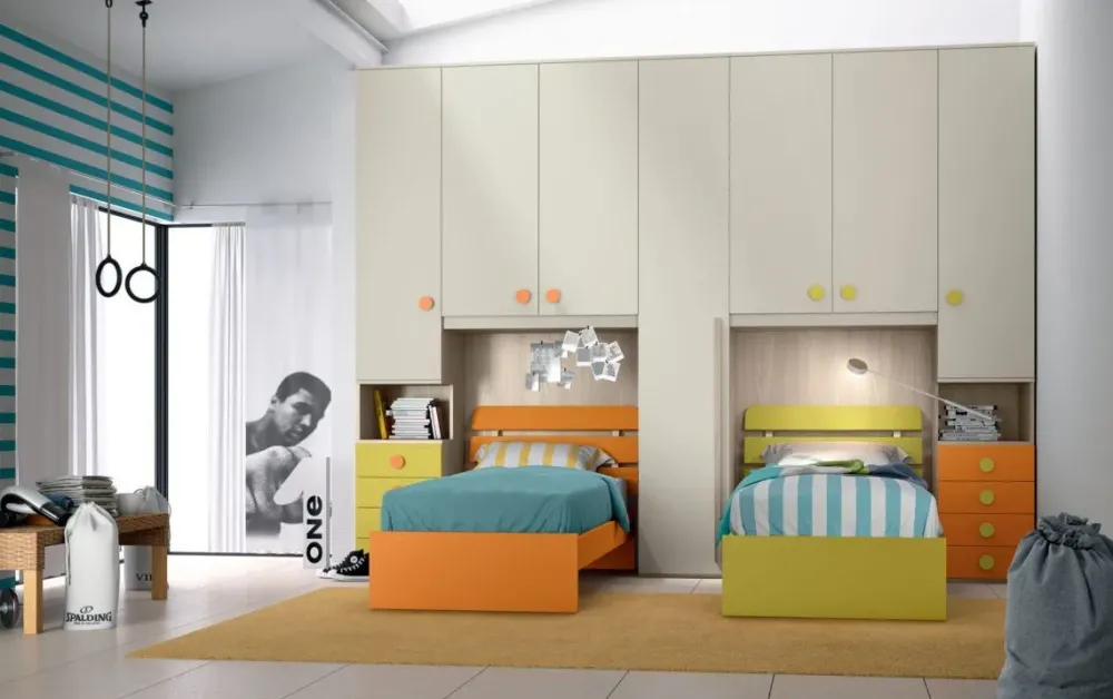 Perché è una vera e propria stanza su misura: il sistema a ponte integra letto, armadi, vani a giorno e pensili in un unica struttura armoniosa, lasciando ampio spazio libero a terra per movimento, gioco e creatività. Le finiture in Olmo, Sabbia, Lime e Arancione donano energia, luce e personalità, trasformando la cameretta in un luogo stimolante e accogliente.
