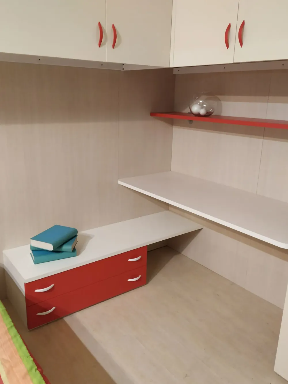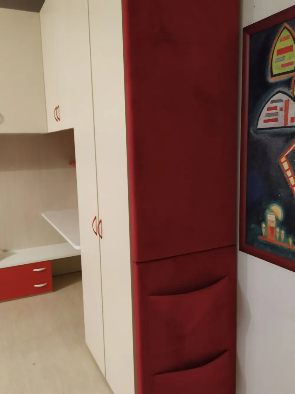 Struttura rovere sbiancato, frontali ante panna, scrittoio bianco cocco, letto con struttura bianco e testata ribes, mensola e frontali cassetto ribes, fianco armadio con sacca rivestito in tessuto rosso.