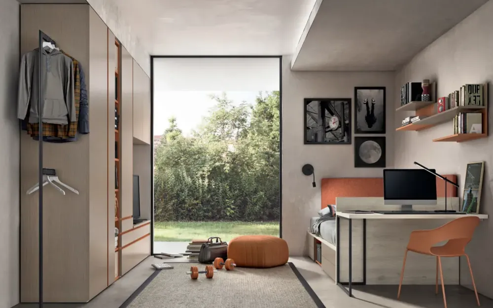 Per creare le atmosfere ideali per lo spazio junior, prediligi camerette dalle tonalità più intense e dalle forme morbide, cosicché l’ambiente possa instillare vitalità e positività; il brand ha optato per un materiale tanto pregiato quanto resistente per questa cameretta Camera moderna per teenager, ossia il laminato materico, così da completare la resa estetica della stanza completandone pure le doti di funzionalità.