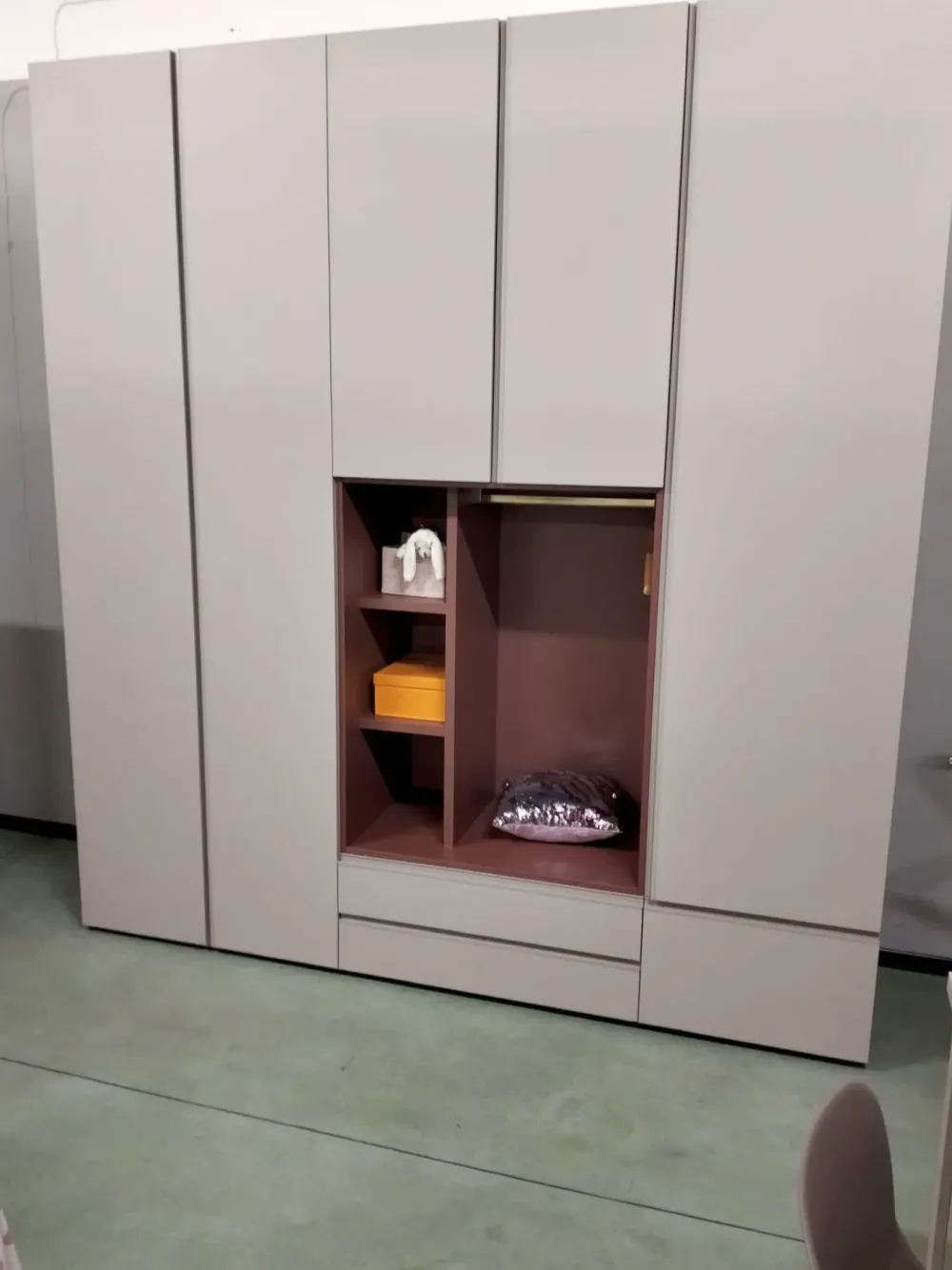 Armadio battente con vano appendiabiti , frontali con gola su ante e cassetti.