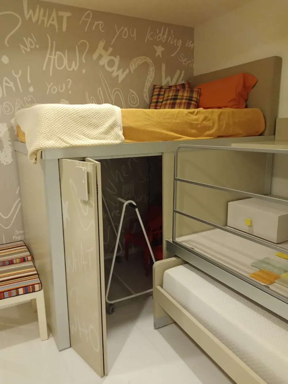 - La cameretta è lo spazio in cui i tuoi figli riposano, si divertono, studiano: in sintesi è lo spazio completamente deputato ai più giovani che, riflettendo il loro carattere, fornisce loro gli input necessari per far fronte alla propria vita quotidiana con vitalità e serenità; tra una vasta scelta di camerette di ogni genere, da quelle a terra a quelle estremamente compatte, da quelle per bebè a quelle per teenager, proponiamo in Offerta Outlet il modello Tumudei tiramolla, ossia una cameretta con letti a soppalco scorrevole.