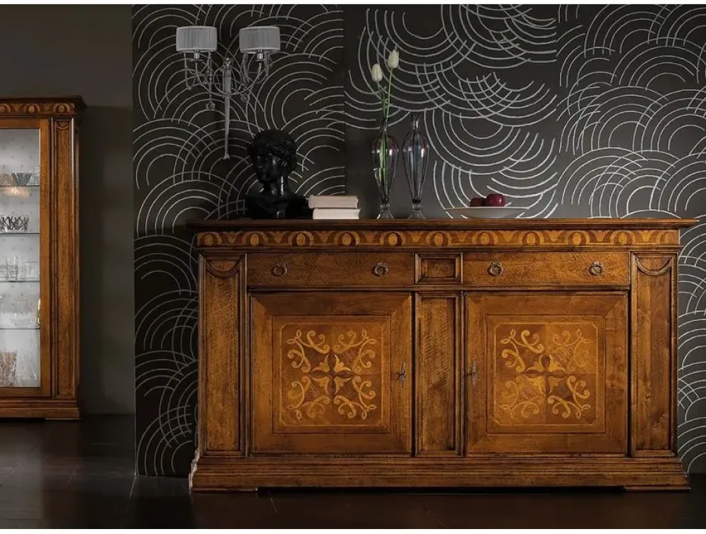 Madia artigianale prodotta in noce massiccio a 2 ante e 2 cassetti con intarsi, le misure sono; L.223 H.120 P.55.
