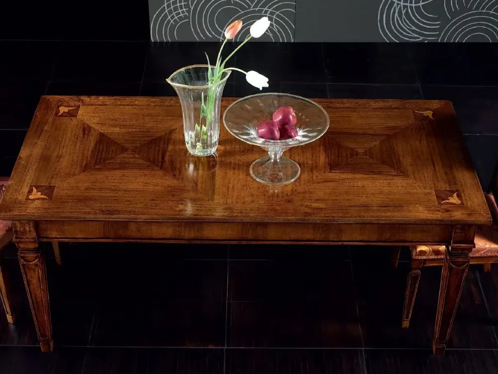 Tavolo artigianale di alta ebanisteria, prodotto in legno di noce con gambe intagliate e piano sapientemente intarsiato, il tutto finito con vernici e cera d’api.