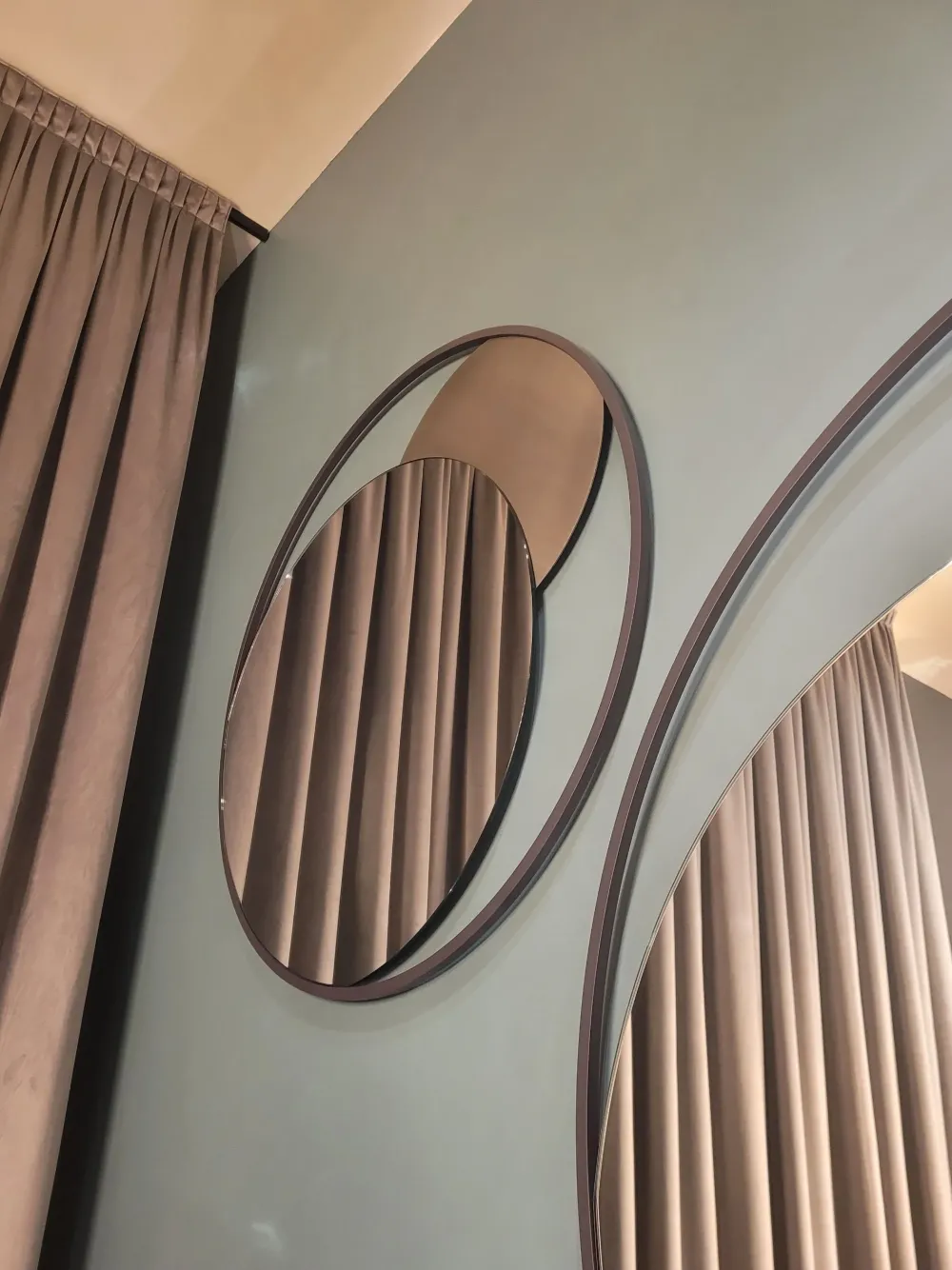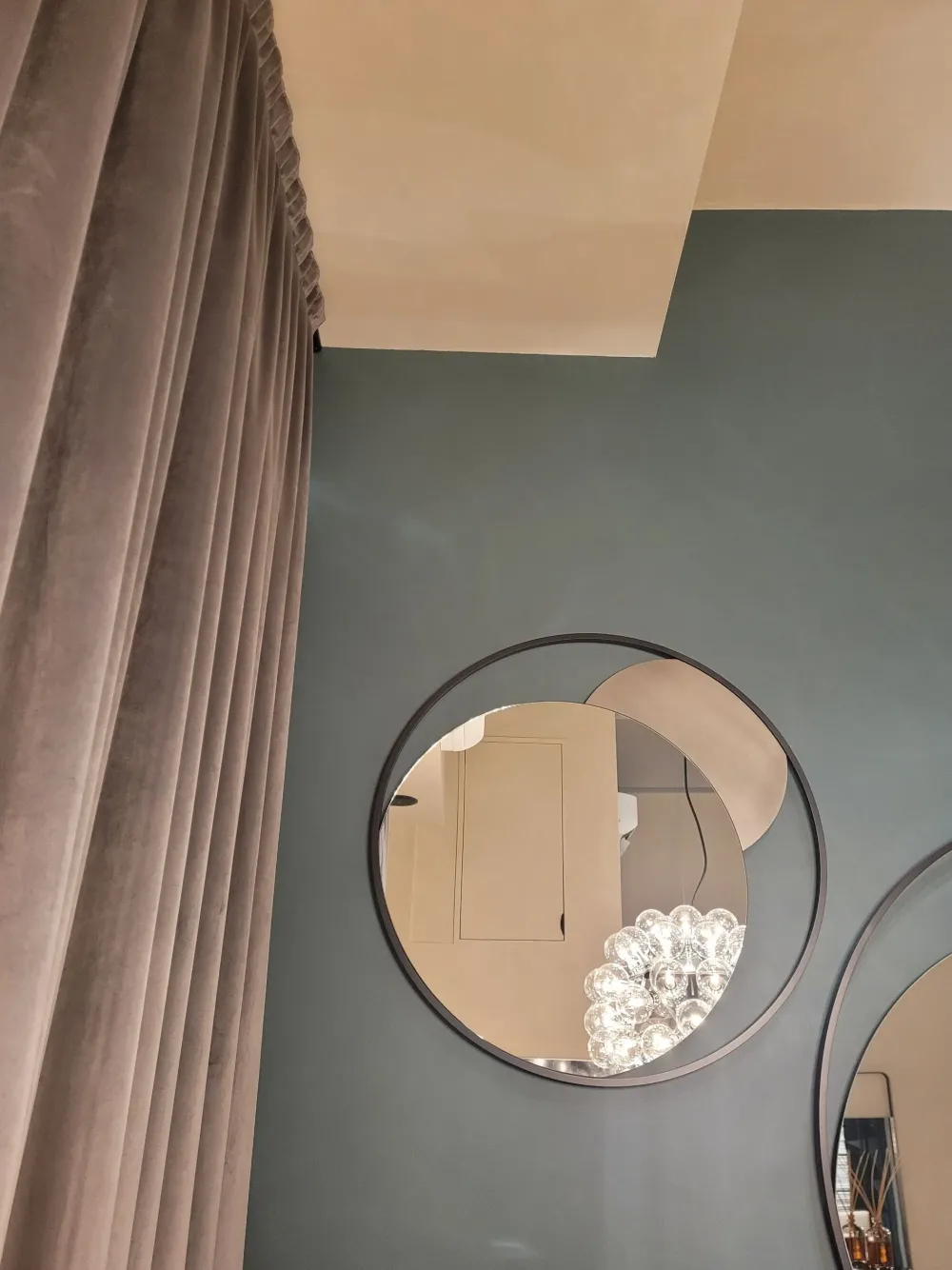 Circe, specchiera dallo stile originale ed essenziale, composta da una struttura esterna rotonda in acciaio pieno a seziona quadrata, all’interno del quale è inserito uno specchio circolare e una semiluna in acciaio personalizzabile con le finiture e decorazioni a campionario.