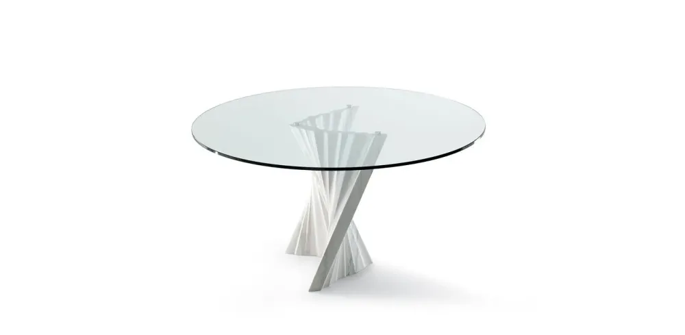 Tavolo con base in marmo Palissandro bianco opaco (BPO). Piano in cristallo 15mm trasparente o trasparente extrachiaro.