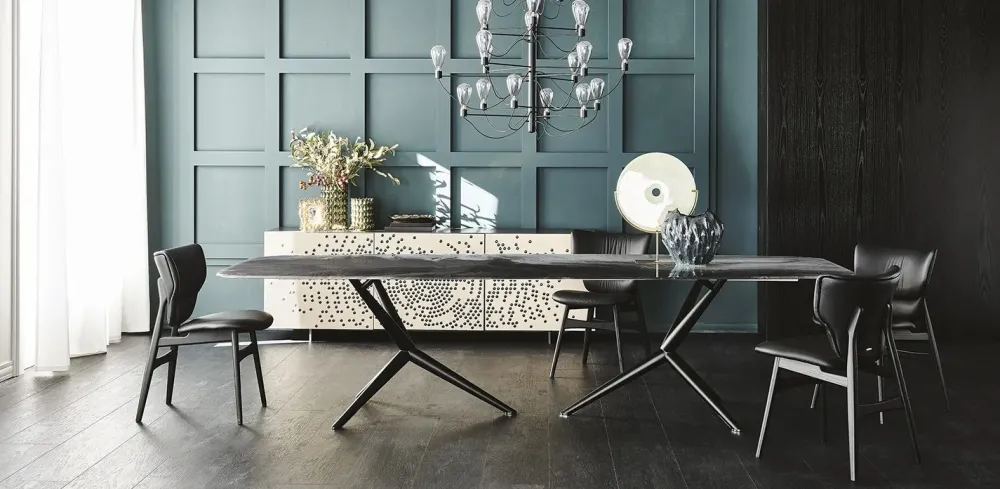 - Presenta un design geometrico e dinamico, che dona un senso di movimento e leggerezza al tavolo pur garantendo solidità.