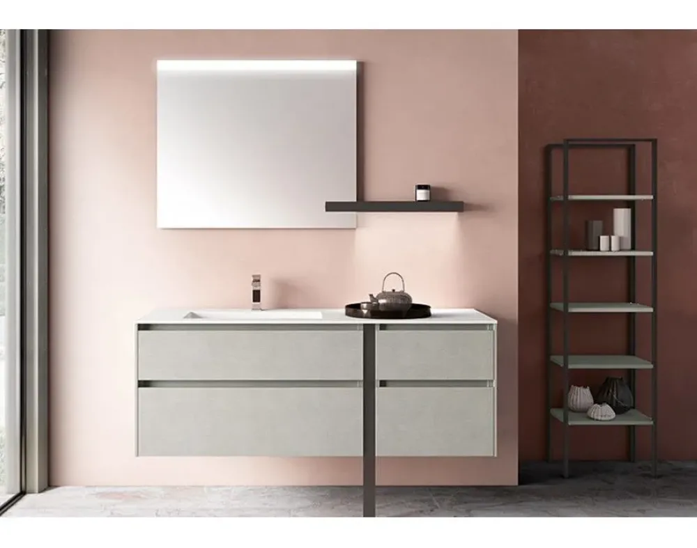 Mobile bagno dal design moderno grazie al piedino frontale in metallo finitura Nichel ripreso anche dalla mensola per specchio con luce integrata.