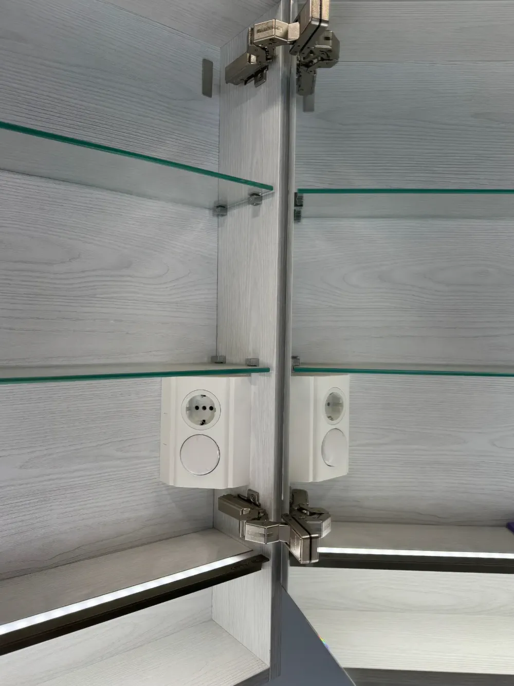 Struttura con finitura Quercia bianca, ripiani interni in vetro. Doppia presa elettrica all’interno.