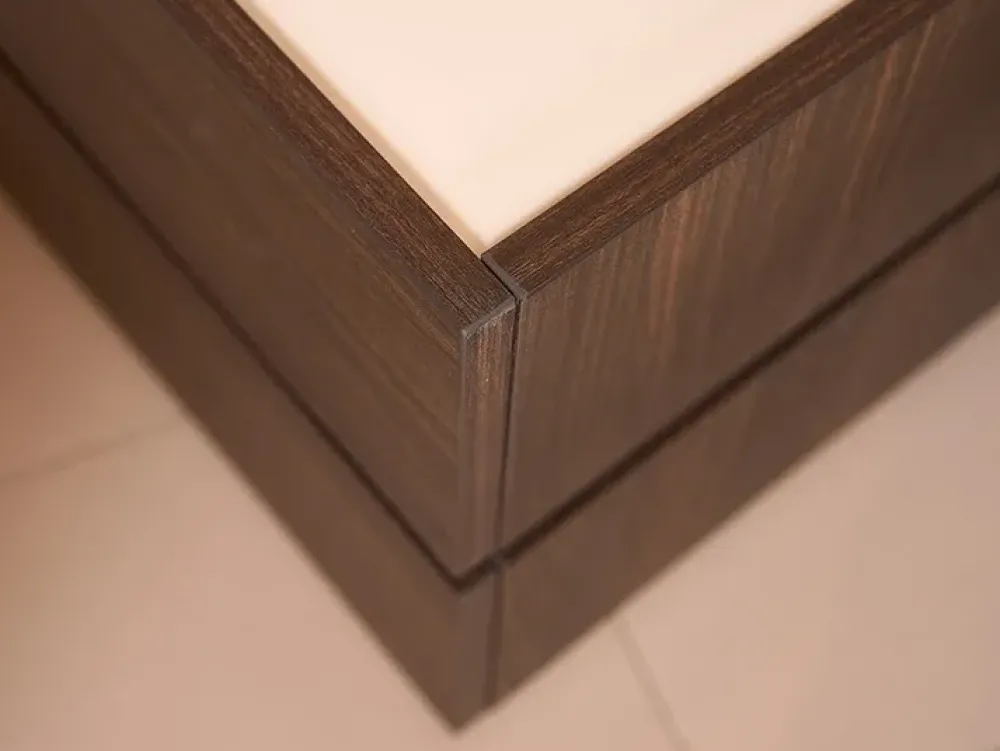 Finiture frontali nobilitato olmo scuro; gola e top laccato opaco tortora.