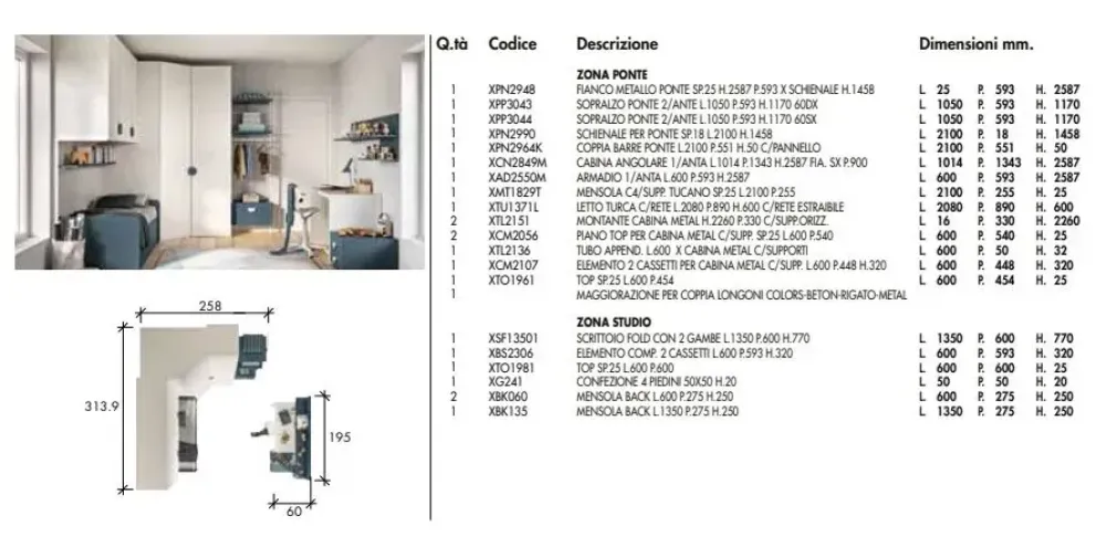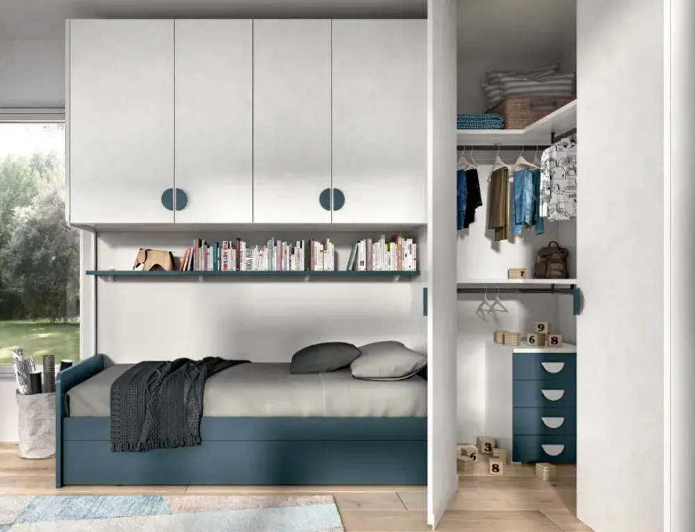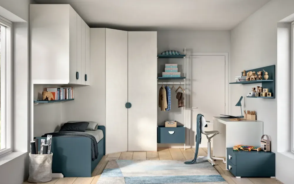 Nel mondo vivace e digitale della Generazione Z, la progettazione delle camerette per i teenager diventa un’opportunità unica per creare ambienti che riflettano la loro personalità, stimolino la creatività e promuovono il benessere. Le camerette per i teen sono molto più di semplici stanze: sono santuari di espressione individuale e connessione. Il letto a scomparsa di questa composizione, è la soluzione ideale per ottimizzare lo spazio nella cameretta. Con il suo design intelligente e funzionale, questo letto offre comfort durante la notte e massima flessibilità durante il giorno, consentendo di sfruttare al meglio ogni centimetro quadrato della stanza. Ha una larghezza di 208cm, profondità 90cm, altezza 60cm. Nella zona riposo troviamo inoltre la cabina guardaroba, che oltre da fungere da testiera, è ideale per organizzare lo spazio nella camera del bambino in modo pratico e funzionale. Con la sua combinazione di cassettiera e ripiani, offre tutto ciò di cui il bambino ha bisogno per tenere ordinato. La cabina angolare ha una larghezza totale di 314cm, altezza 258cm, profondità 195cm. A completare la camera troviamo lo scrittoio Fold, realizzato con materiali di alta qualità e finiture impeccabili, compreso di mensola Back. Design moderno e accattivante, perfetto per creare un angolo studio personalizzato e stimolante. Ha una larghezza di 195cm ed altezza 77cm. Rete inclusa. Escluso invece il materasso. Personalizzazione delle finiture senza variazione di prezzo. Consegna compresa nel prezzo, 30-40 giorni lavorativi. L’offerta per questa cameretta è di euro 3600,00. Per maggiori informazioni contattaci via mail o passa a trovarci nel nostro showroom.