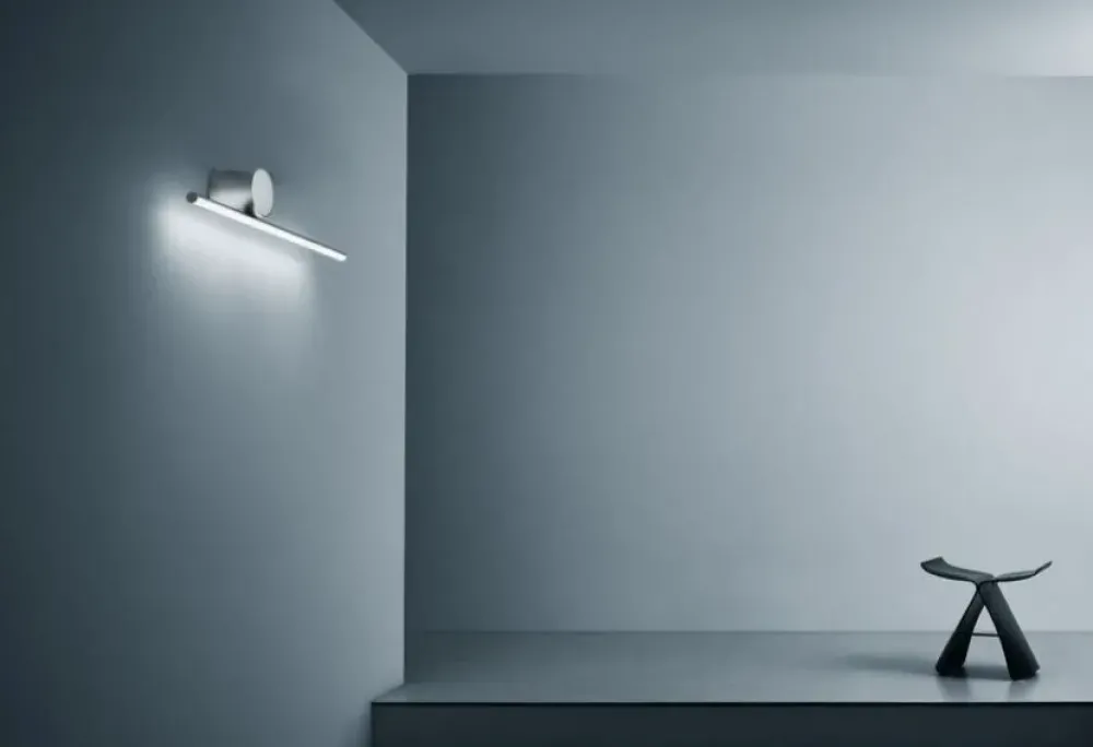 Apparecchio di illuminazione a luce diffusa da installare a parete, composto da un asta orizzontale (modello Wall 1). Ogni asta è costituita da un corpo in alluminio estruso, lavorato e anodizzato color argent e da un diffusore in silicone ottico platinico con striscia LED integrata (CRI 90). Ogni modello è dotato di un proprio rosone, la cui elettronica integrata utilizza solo il sistema di dimmerazione TRIAC.