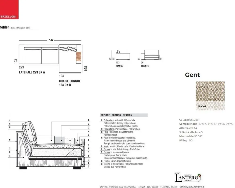 dimensioni totali ingombro lunghezza cm. 347 profondita cm. 103 profondita’ chaise longue cm. 158