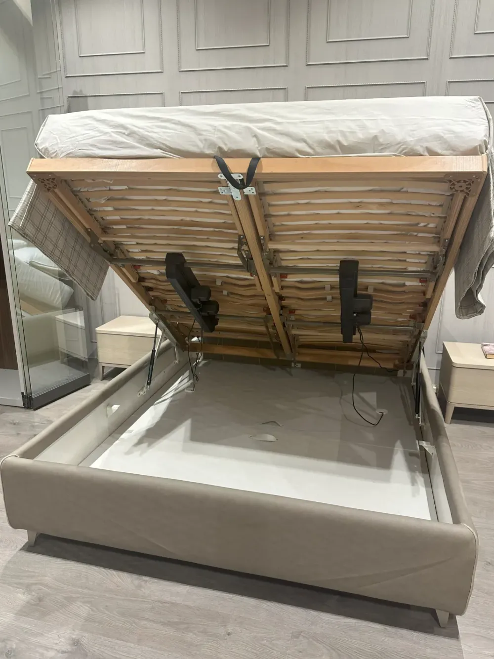 Letto modello Malika con box contenitore h.30 cm e rete elettrica con movimento lato testata e lato pediera che permette di elevare le due zone per un comfort senza limiti.
