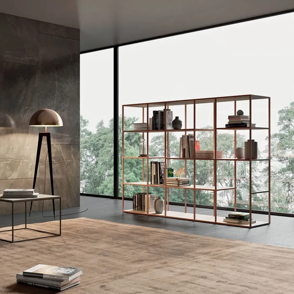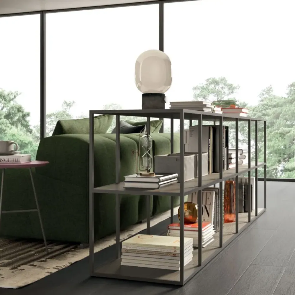 A un telaio laccato opaco è possibile abbinare schiene e ripiani di diverse finiture.