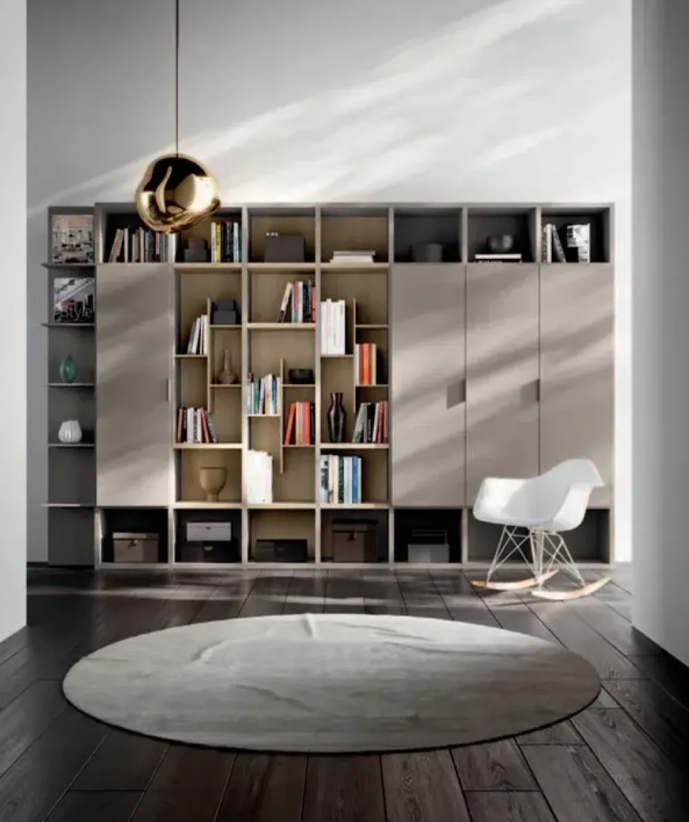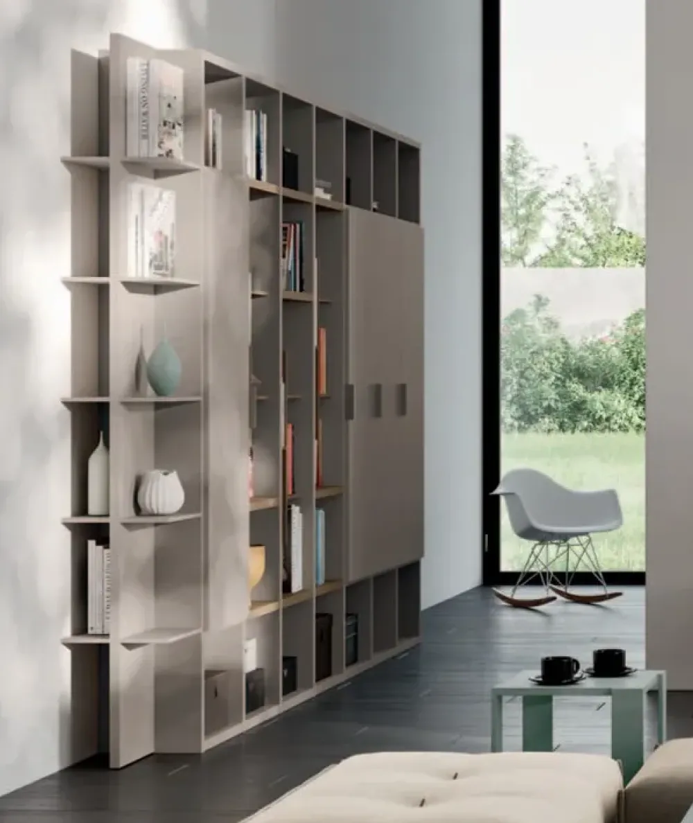 Le linee essenziali e la palette cromatica neutra tra il grigio caldo e il tortora rendono la parete libreria una scelta ideale per ambienti moderni, minimal e di classe.