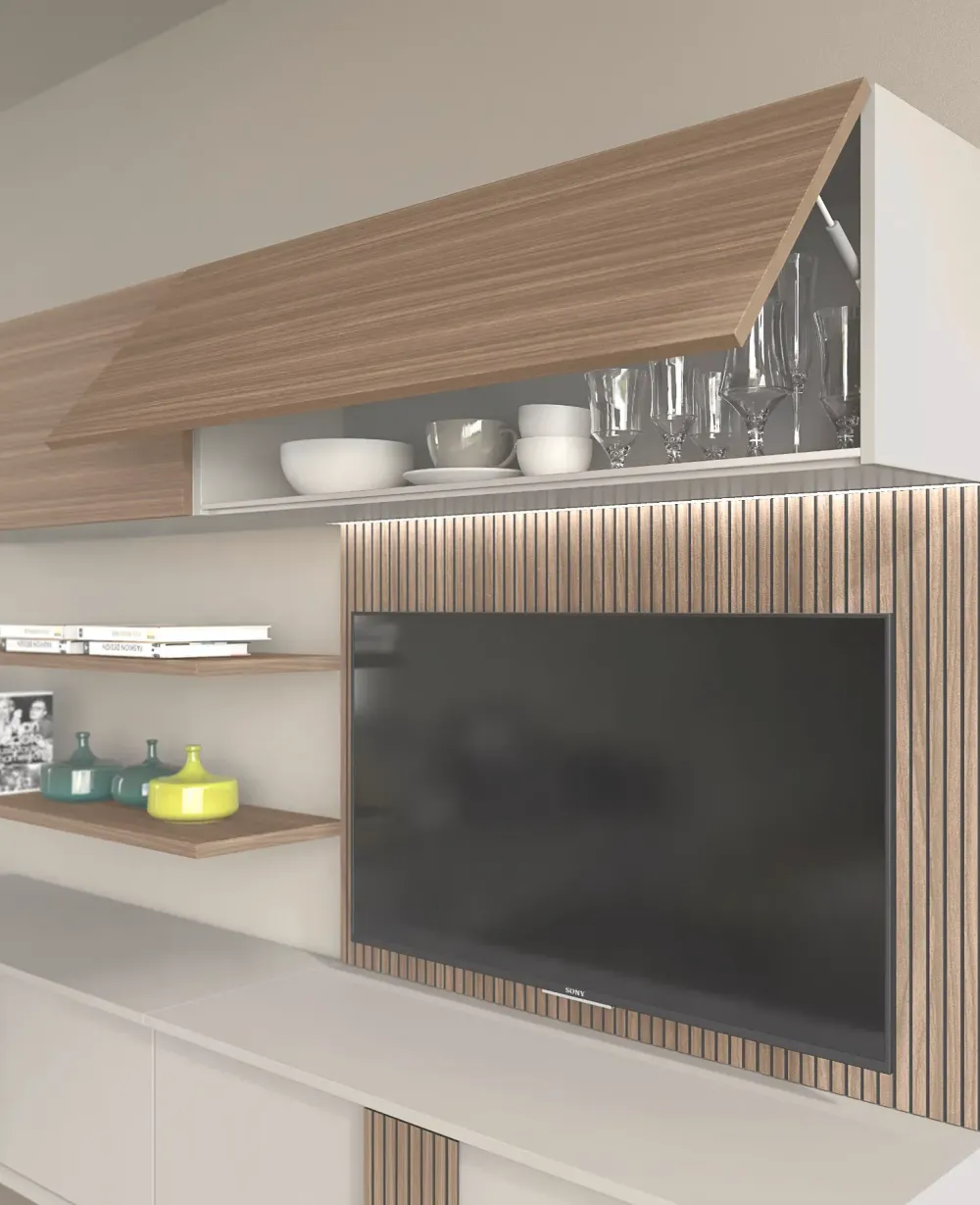 Linee essenziali, finiture moderne e una raffinata combinazione tra tortora e legno: la serie Riga è pensata per chi cerca un living personalizzabile e di carattere. Moduli sospesi, vani chiusi o a vetro, pensili e mensole si combinano liberamente per creare pareti attrezzate su misura, funzionali e dal gusto contemporaneo.