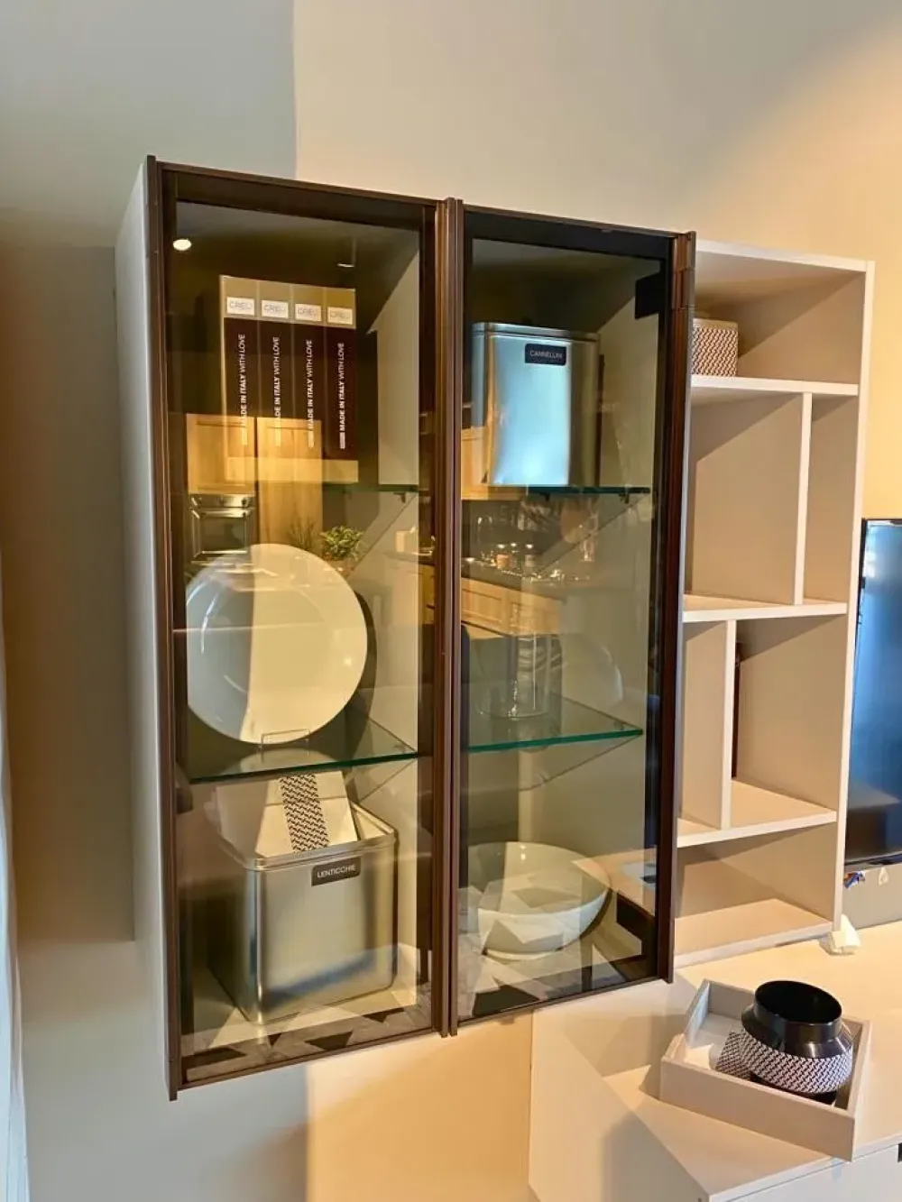 Da notare il particolare vetrina ed il mobile sospeso con due cestoni.