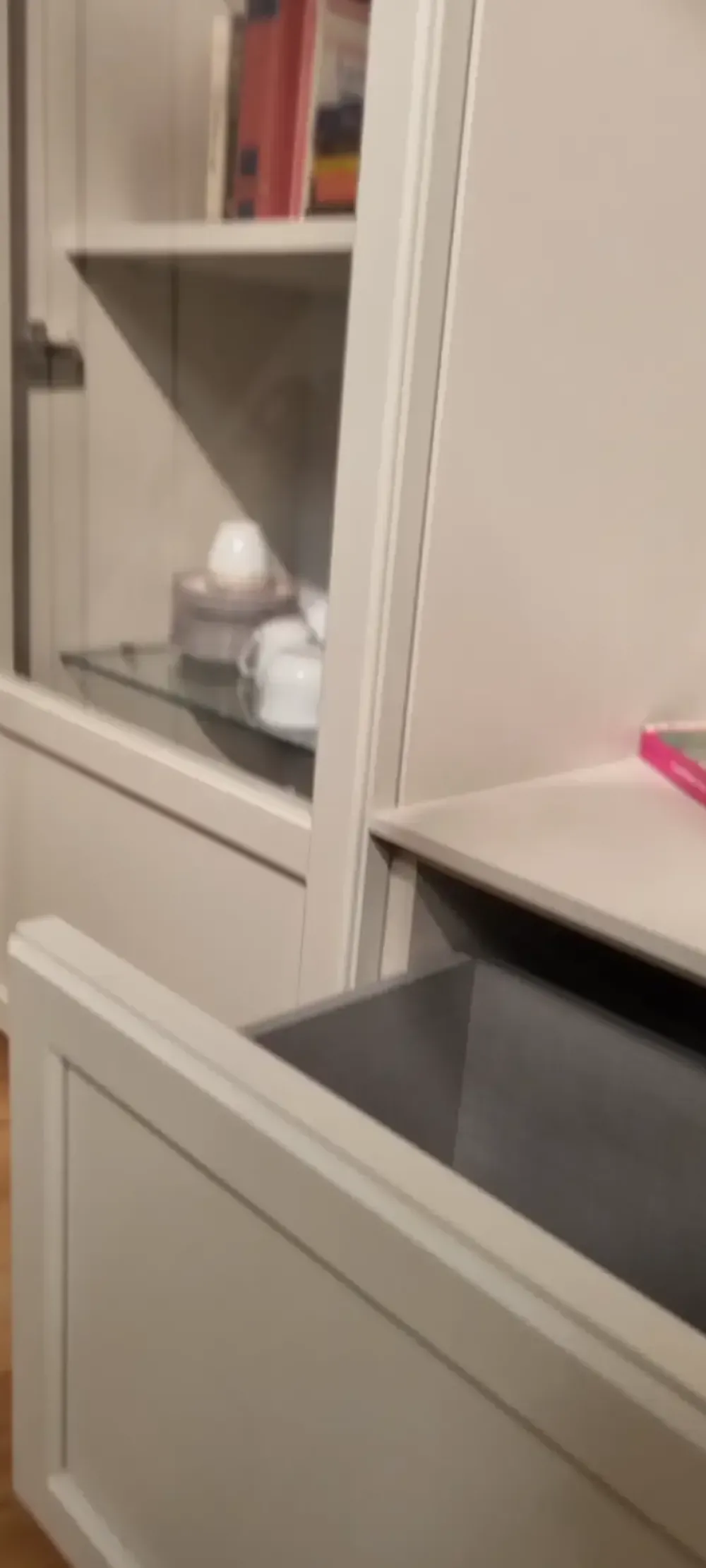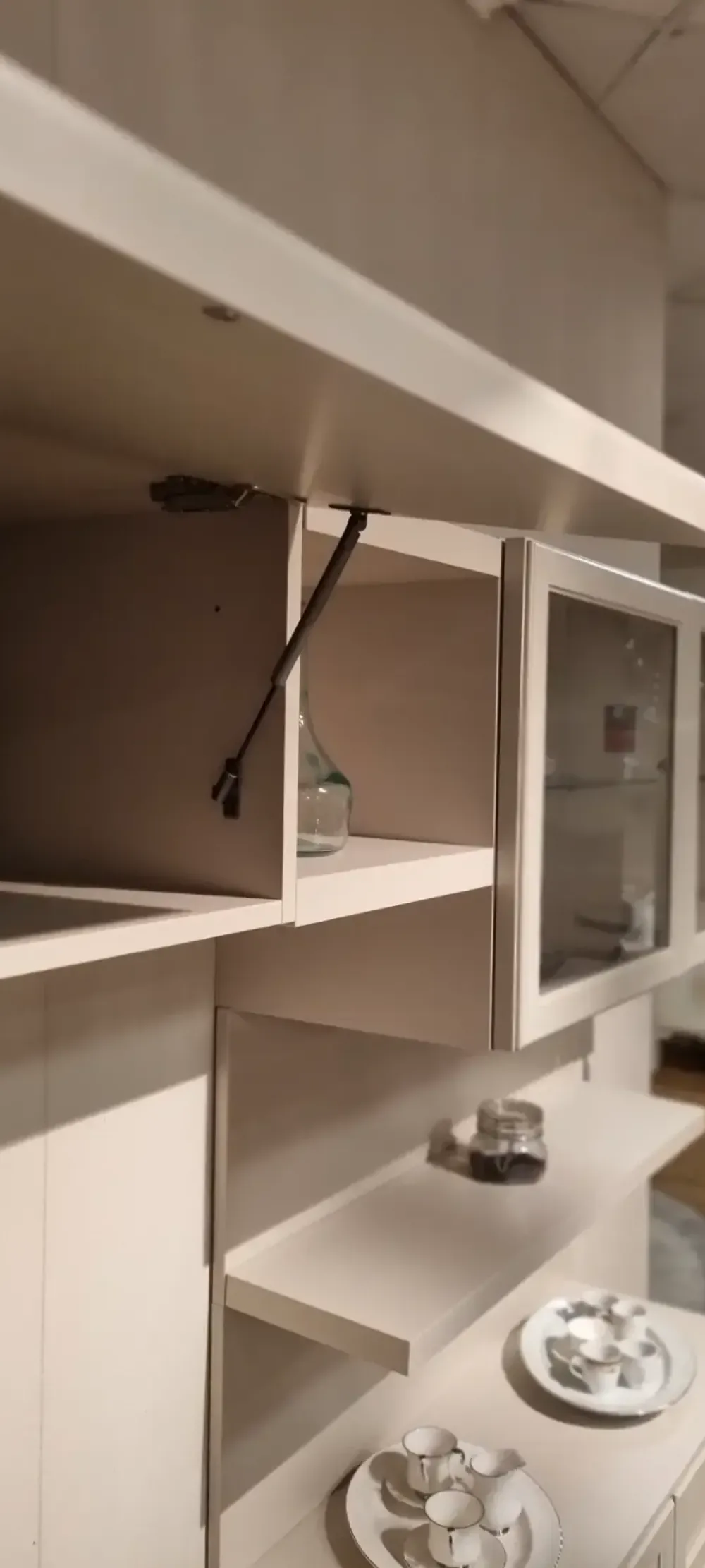 Composizione soggiorno modello Gardenia in frassino juta con pensili in vetro, boiserie e mensole.
