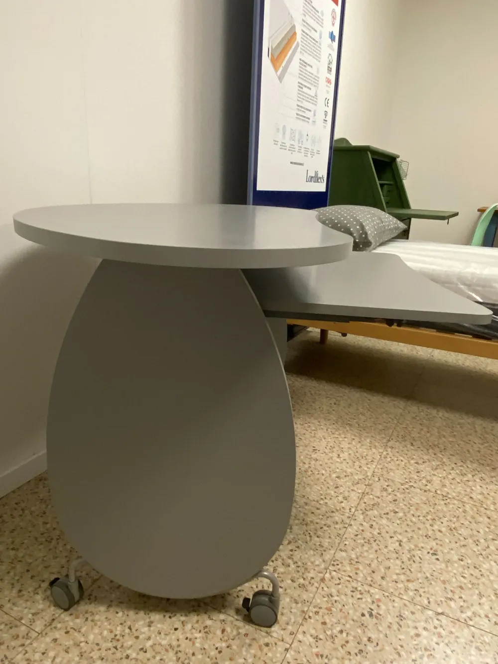 Scrittoio di forma ergonomica sagomato. Realizzato in melaminico grigio argento, a tre piani: piano superiore e inferiore fissi, piano centrale estraibile porta tastiera-computer.