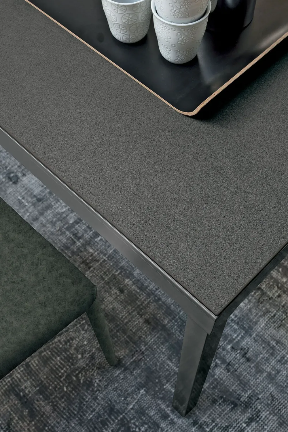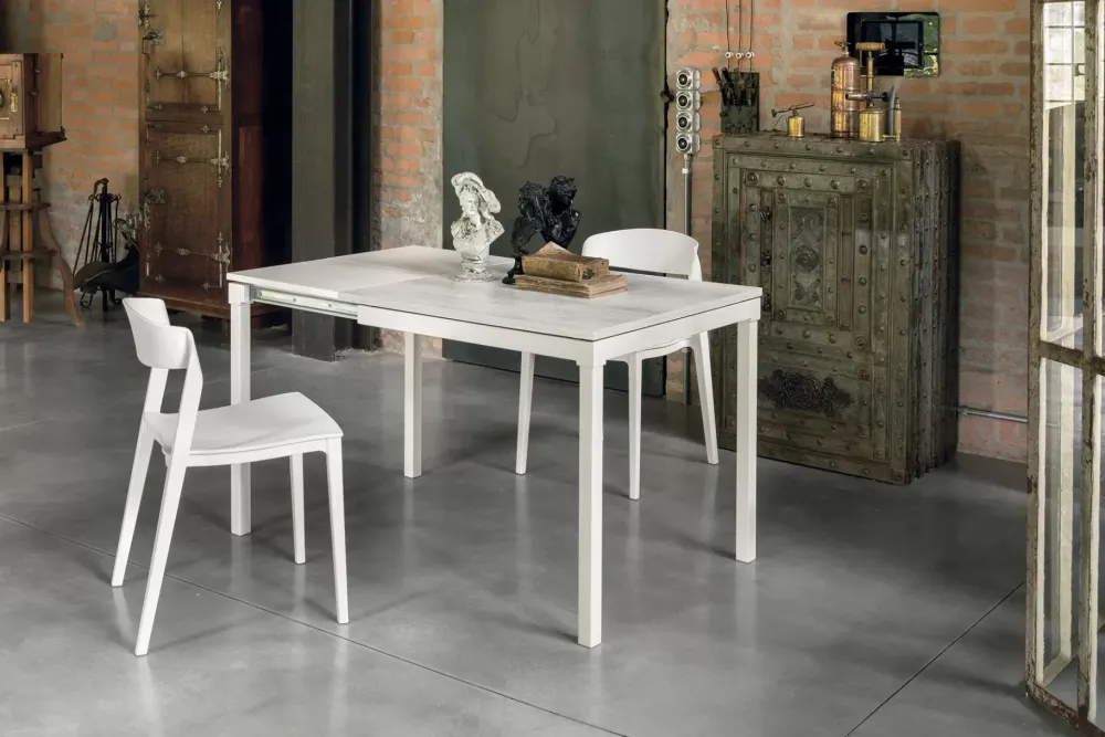 Tavolo allungabile con struttura in metallo verniciato, piano in gres porcellanato o vetro temperato o in laminato ed allunga laterale in MDF laccato in tinta con la struttura.