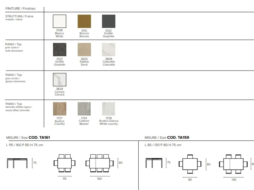 Dimensioni disponibili: 85×80 cm estensibile a 130×90 cm e 115×80 cm estensibile a 160×80 cm