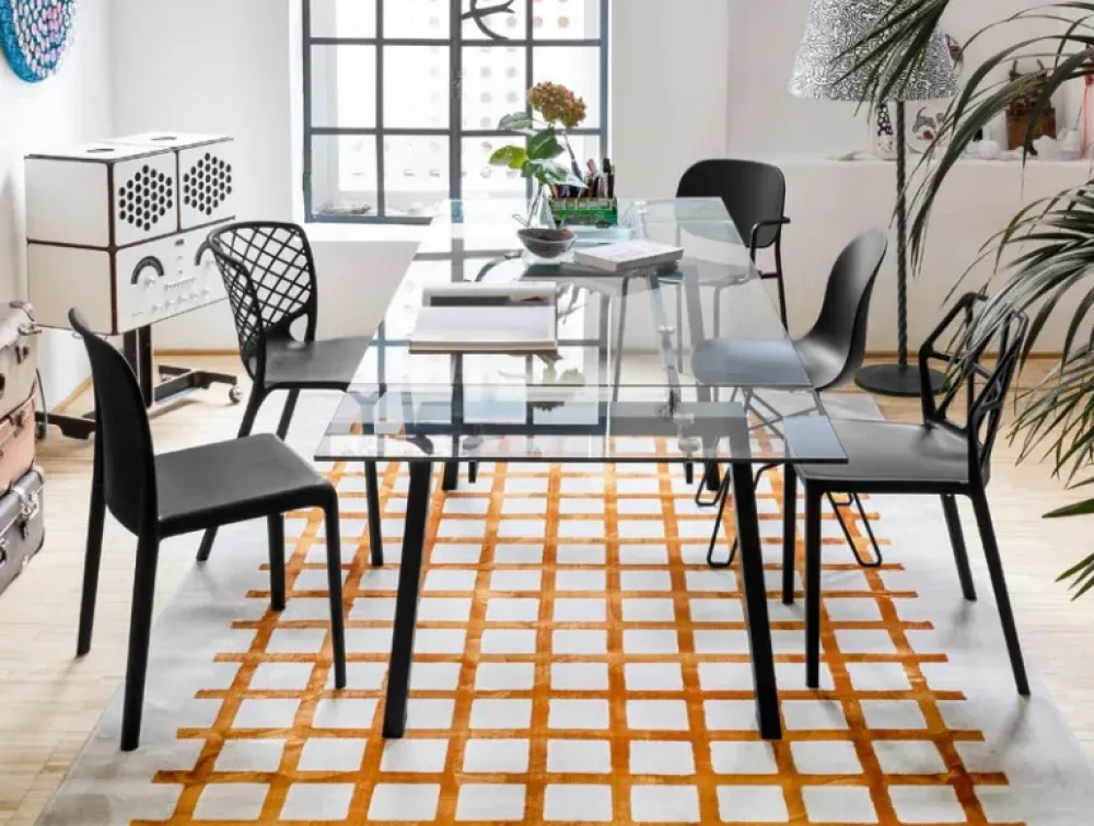 Zeffiro è il tavolo allungabile con piano in vetro o ceramica. Disponibile con struttura in metallo, il tavolo è allungabile grazie a due allunghe laterali indipendenti, che agiscono su guide in alluminio, in tinta con le gambe.