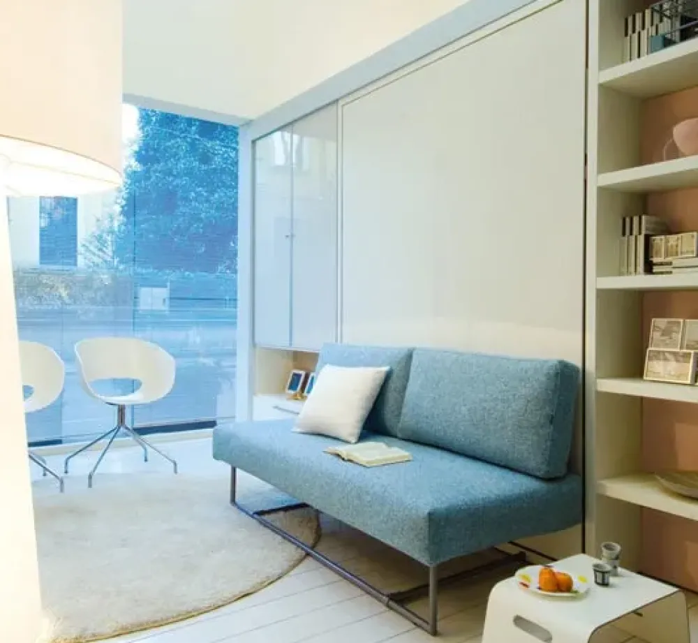 - Letto matrimoniale sempre pronto: apertura verticale rapida e intuitiva, con rete a doghe in legno per un sostegno ottimale. Il letto si abbassa con un semplice gesto, grazie a un sistema di ganci laterali integrati tra fianco e pannello.