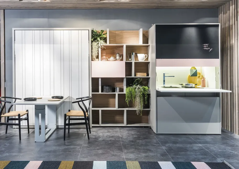 Kitchen Box è una minicucina trasformabile e integrabile nei programmi Living & Young System per ambienti dinamici e multifunzionali. La cucina a scomparsa nelle versioni Basic e Plus, con finiture melaminico e laccato, si compone con un mobile monoblocco lineare e componibile, collegato ad un’anta attrezzata girevole con apertura a libro, che funge anche da sistema di chiusura per nascondere la cucina all’occorrenza. L’anta attrezzata girevole, con apertura dx o sx, è organizzata a dispensa e con un piano tavolo integrato a ribalta, che all’apertura si allinea con il top del monoblocco, raddoppiando così lo spazio utile come piano di lavoro. Il piano tavolo integrato può essere aperto e utilizzato anche quando l’anta attrezzata è chiusa. Entrambe le versioni sono realizzate con materiali idrorepellenti, top e piano tavolo in Fenix anti impronta e resistente ai graffi, sono complete di elettrodomestici e accessori, e vengono realizzate con configurazioni standard fisse come da listino. La cucina è predisposta per l’inserimento di un dispositivo che disattiva piano cottura e forno quando questa è chiusa. Con l’apertura dell’anta l’alimentazione si riattiva.