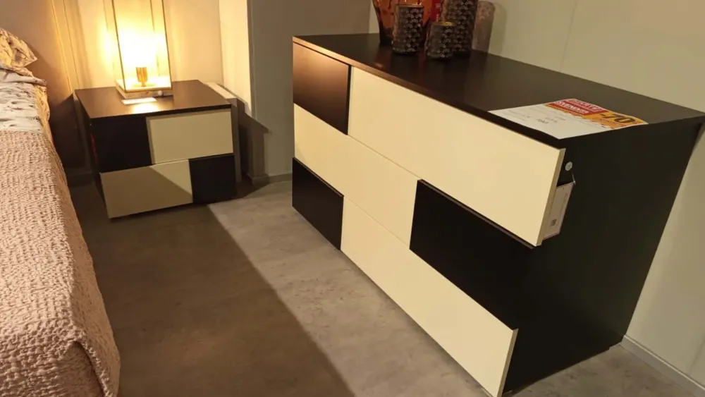 Gruppo notte composto da 1 comò e 2 comodini in finitura perla e nero opaco.