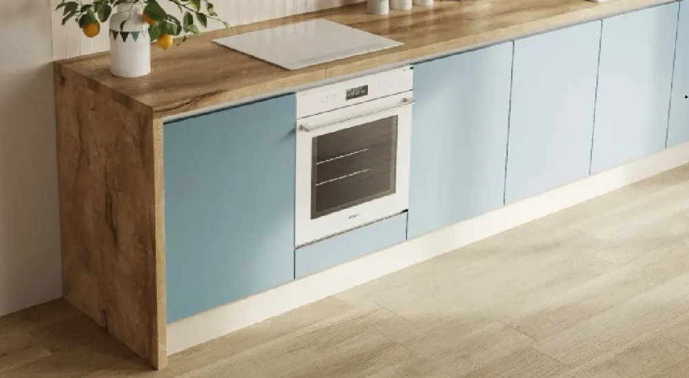 Scopri la cucina moderna nordic celeste effetto legno, una soluzione di con Nuovi Mondi Cucine!