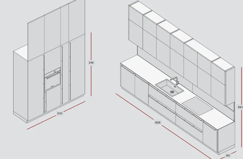 La coerenza della modularità dei pensili dona equilibrio alla composizione e genera un senso di ordine che apre la scena al piano lavoro, organizzato per eseguire