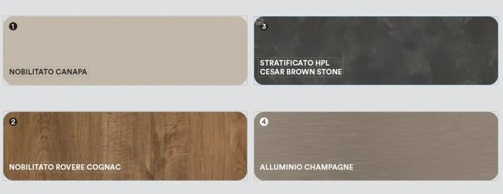 L’eleganza moderna delle maniglie in finitura Champagne armonizza con le tonalità naturali del piano in Laminato Cesar Brown Stone e delle ante in Nobilitato Canapa, definendo un ambiente morbido e accogliente.