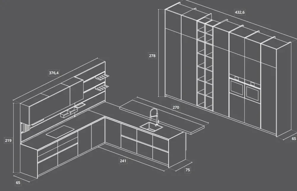 Il profilo ad L in metallo posto in testa all’anta della cucina agevola l’apertura e dona linearità estetica all’intero ambiente. Le gole verticali dettano il ritmo delle colonne che si elevano fino al soffitto assicurando il massimo contenimento. I vani a giorno Espace completano la composizione integrandosi al meglio nel contesto con finiture e materiali abbinati al modello.