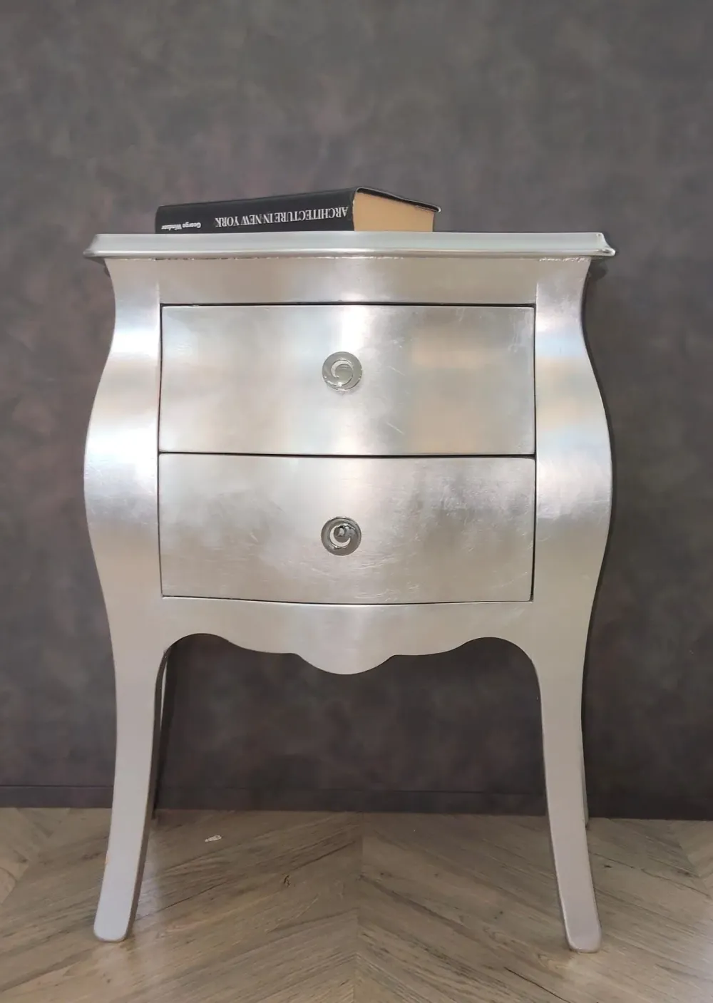 Se desideri comodini in legno per la tua camera, il modello Bombato foglia argento in foto si rivelerà l’ideale.