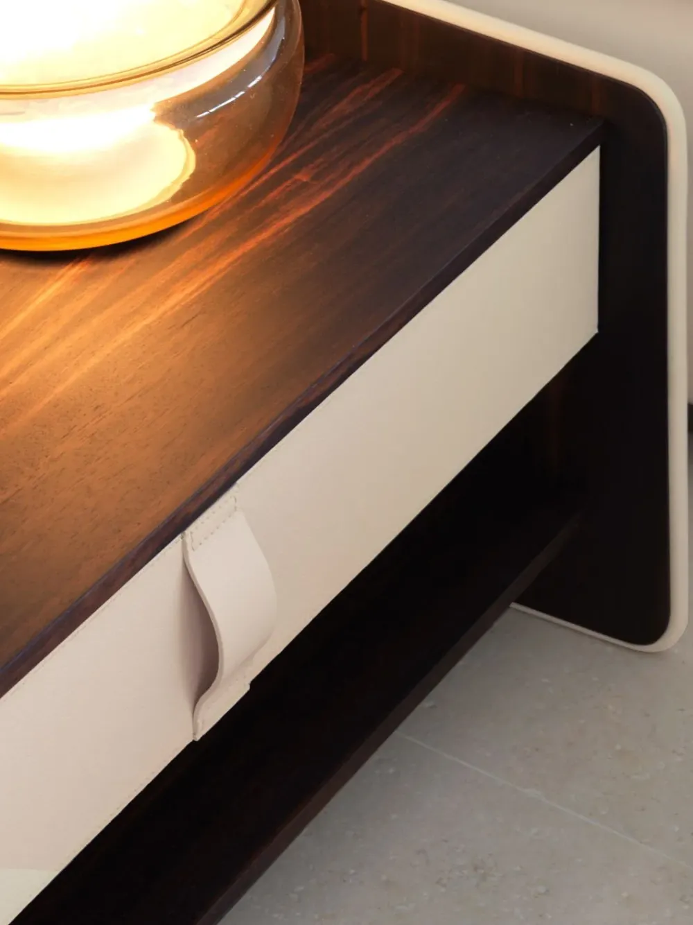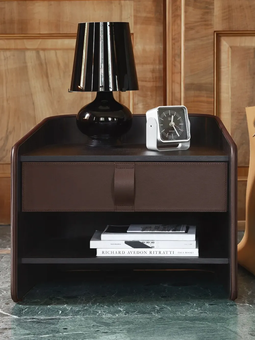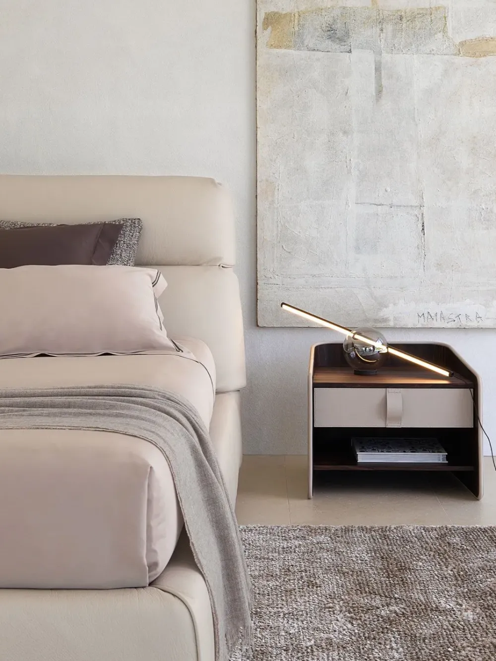 DESIGN CARLO COLOMBO, 2014 I comodini Gentleman, nell’eleganza delle linee, nella preziosità dei materiali e nell’ accuratezza delle lavorazioni esprimono appieno i valori del vero Made in Italy. Struttura in legno multistrato di pioppo curvato rivestito esternamente in pelle, internamente in ebano (finitura opaca). Cordonetto perimetrale in pelle (stesso colore della struttura o a contrasto). Piano superiore e piano inferiore in ebano. Frontali e maniglie in pelle. Comodino Gentleman di Flou Misura: L 58 x P 52 x H 49 Struttura in legno multistrato di pioppo Rivestimento esterno in pelle categoria 1 di riferimento, internamente in ebano finitura opaca Cordonetto perimetrale e maniglie in pelle Interno in multistrato di betulla tinto nero Il prezzo si riferisce al prodotto come da descrizione sopra riportata. Spedizione esclusa La descrizione si riferisce all’articolo fotografato e l ‘immagine è solo a scopo esplicativo. Per qualsiasi necessità e/o chiarimenti vi invitiamo a contattarci direttamente.