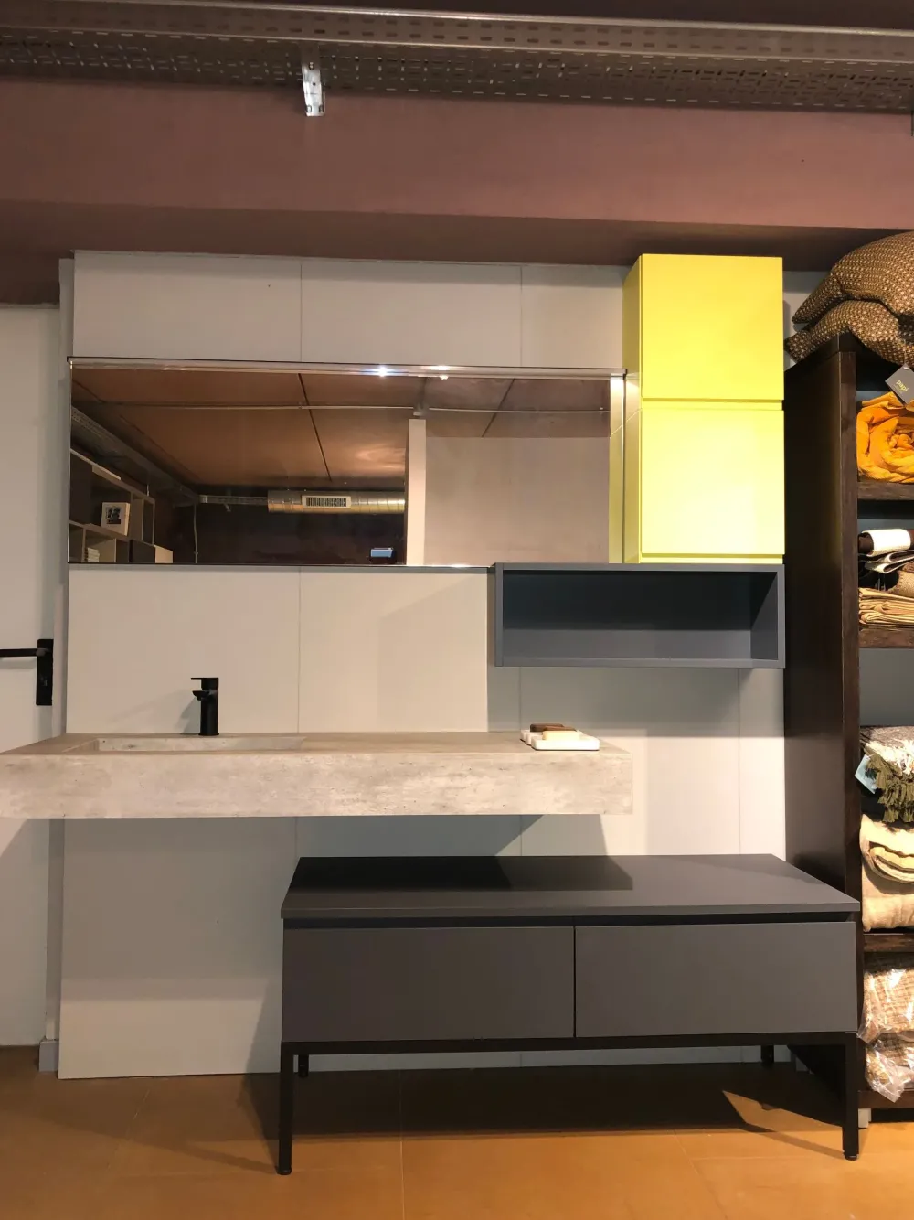 – Arredo bagno indipendente laminato piombo. Che può essere allineato al top per mantenere una linea più classica oppure spostato (come in fotografia) per dare un tocco di modernità al tuo bagno.