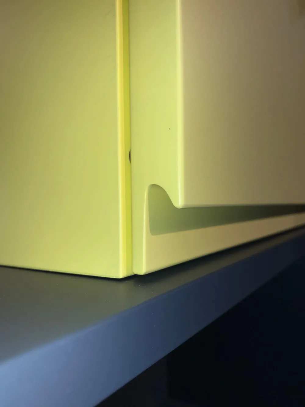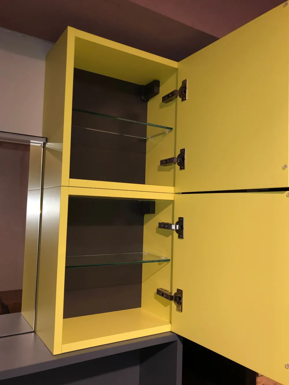– Pensili laccati blu cobalto e giallo olio. Un abbinamento in palette per chi ama i contrasti e gli accostamenti di carattere.