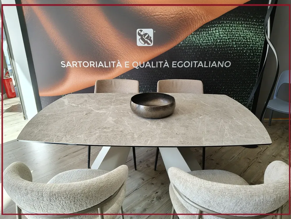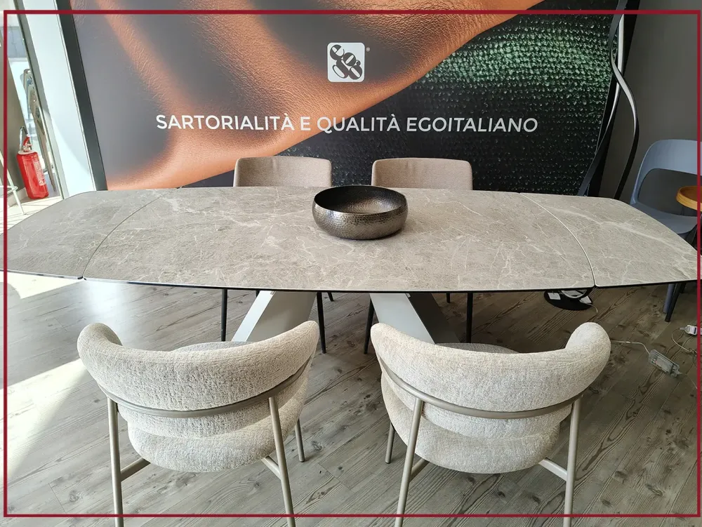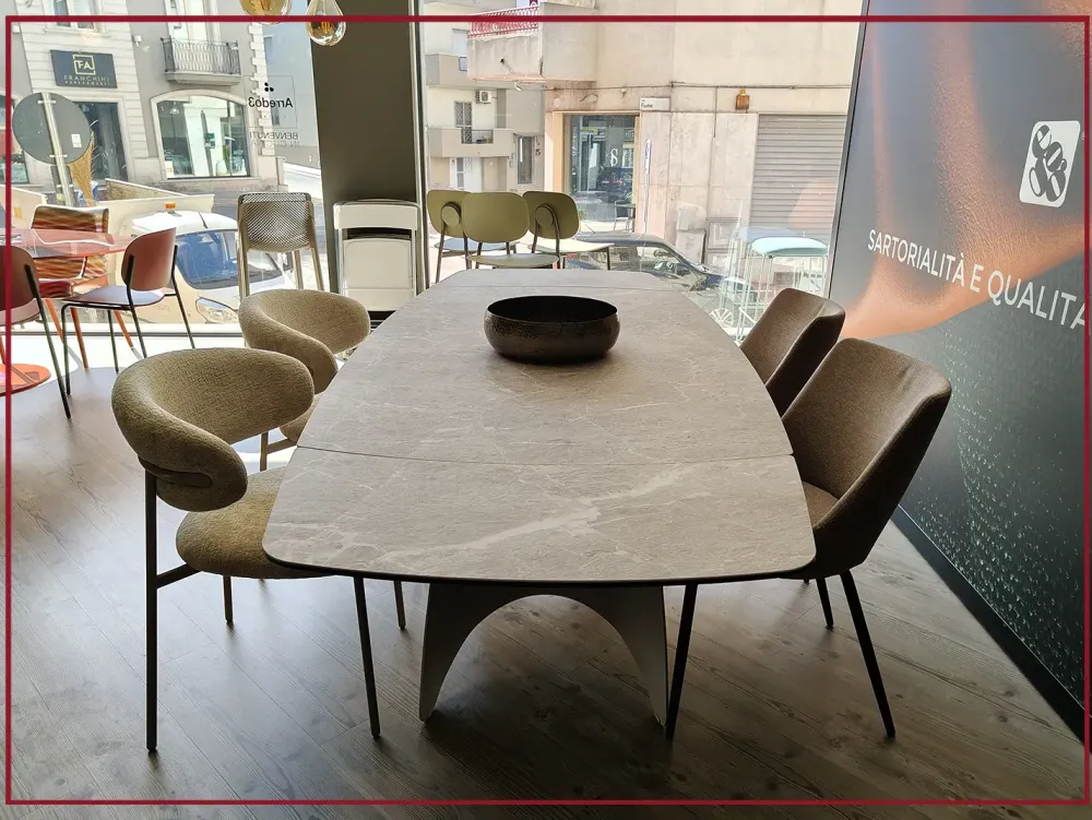 Il piano ovale, in ceramica di grande pregio, si estende con naturalezza grazie a due allunghe laterali che permettono di accogliere fino a dodici persone, trasformando ogni occasione in un momento conviviale senza rinunciare allo stile.