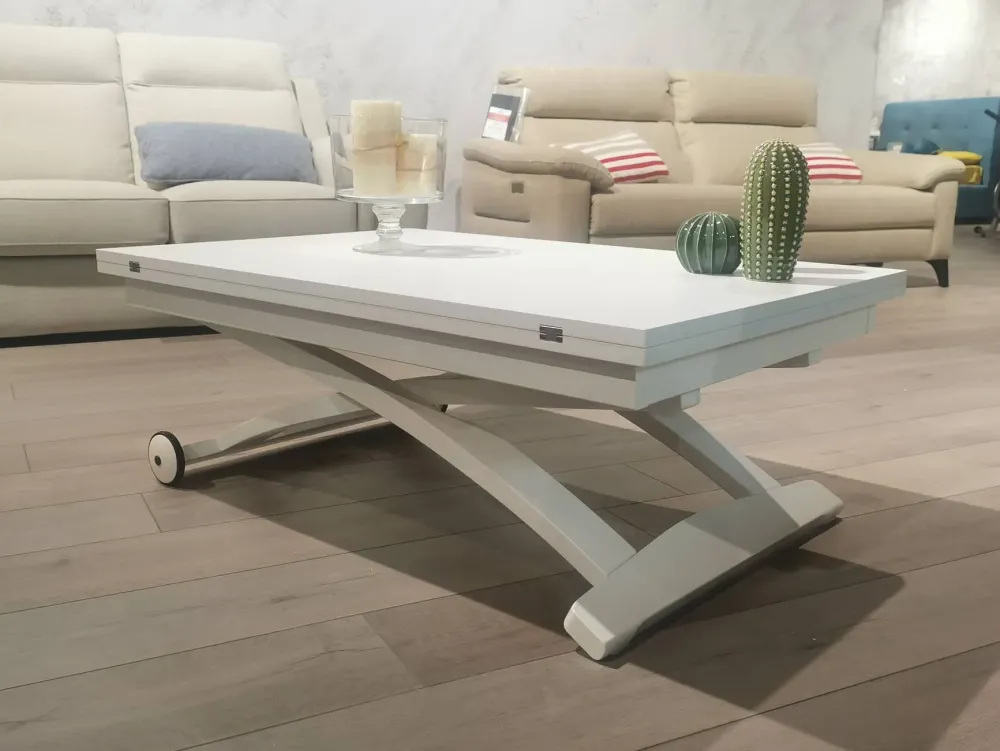 Mascotte è perfetto per arredare il salotto con eleganza, ma è ideale anche per i mini appartamenti o per stanze dagli spazi limitati: può infatti fungere da tavolino e nello stesso tempo da tavolo da pranzo. Premendo il tasto posto sul cassetto, è possibile regolare l’altezza del tavolo trasformabile in 7 diverse posizioni (da 32.5 cm a 74 cm). Il piano in impiallacciato misura invece 105 x 70 cm, allungabile a 105 x 140 cm grazie alla pratica apertura a libro.