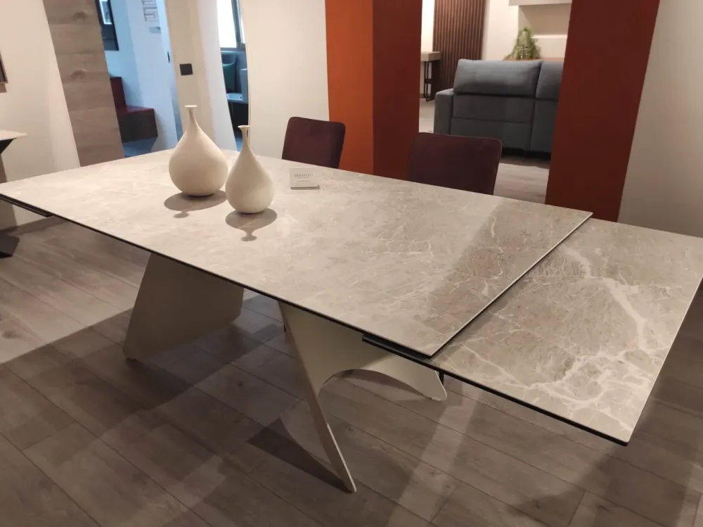 Tavolo Orion di Connubia , sviluppato su struttura in metallo laccato bianco ,con top in ceramica in arenaria , ha un sistema estendibile con due allunghe anch’esse in ceramica opaca.