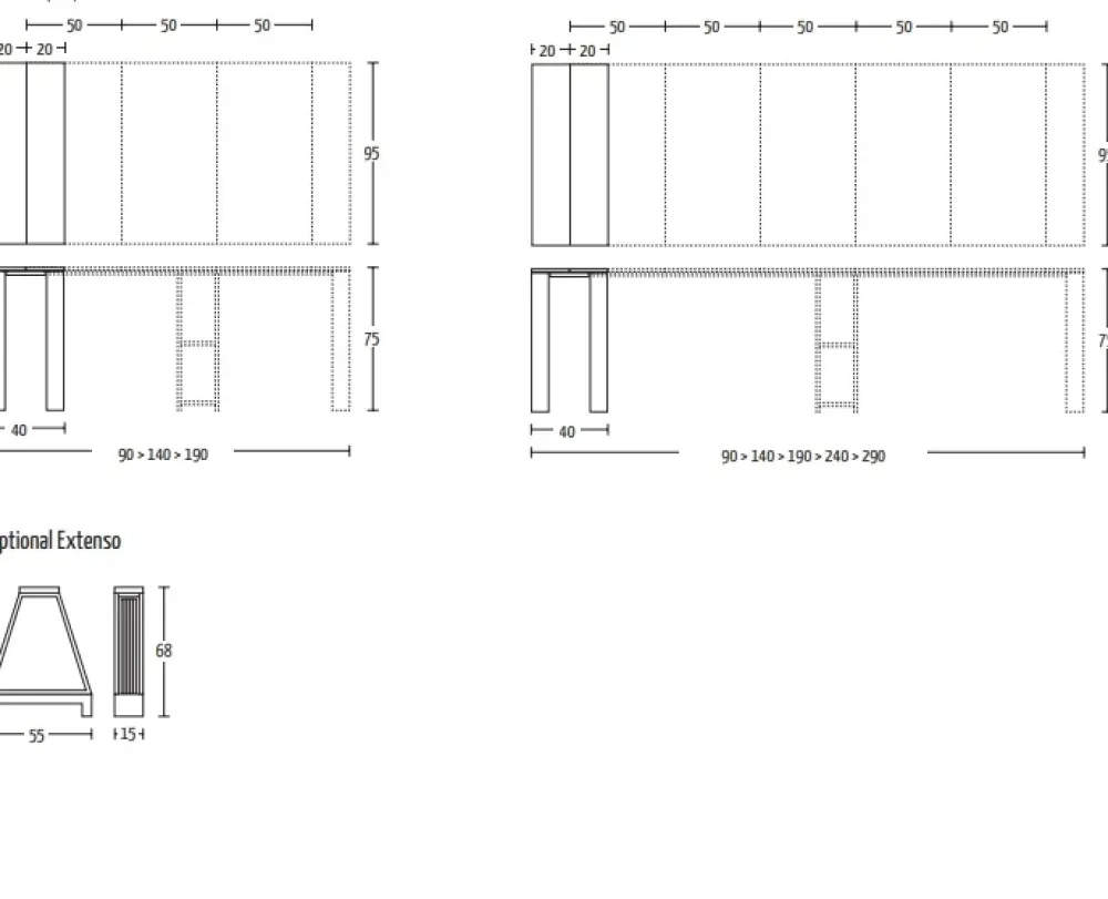 Dimensioni chiuso: 95x40x75H cm,dimensioni aperto:fino a 190 con tre allunghe e 290 cm con 5 allunghe .Brevettato.