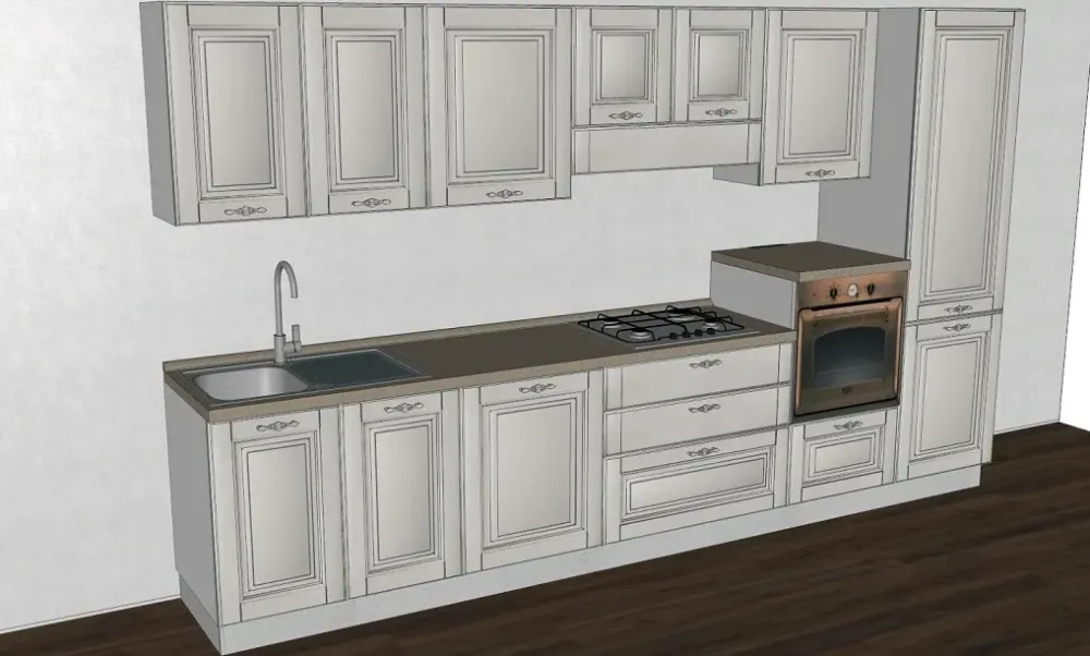 Sono esclusi dal prezzo della cucina gli elettrodomestici (forno, piano cottura, lavastoviglie, frigorifero ad incasso, lavello e miscelatore), i fianchi a vista in finitura come l’anta e la cornice sopra-pensile.