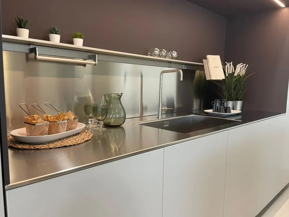 Tutte le ante in finitura fenix grigio chiaro piano in acciaio inox con lavabo vasca grande integrato.