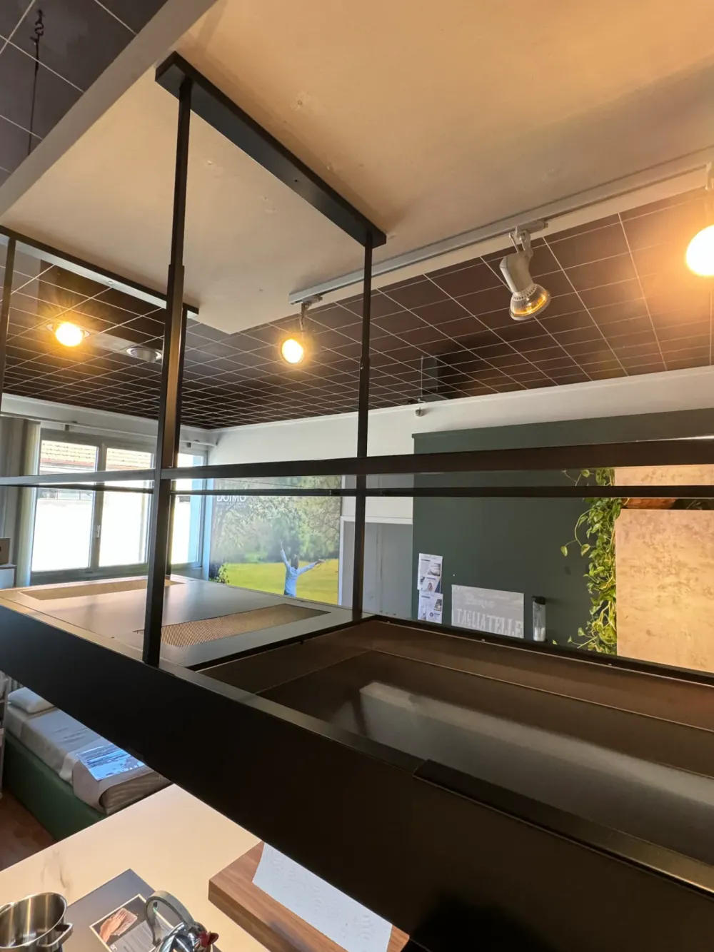 Sopra l isola troviamo la cappa con struttura verniciata nera, equipaggiata con mensole in vetro fumé, prese elettriche e area predisposta per vari accessori e funzionalità aggiuntive quali ad esempio un porta mestoli e porta rotolo.