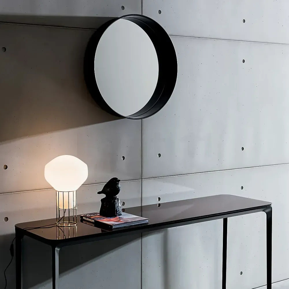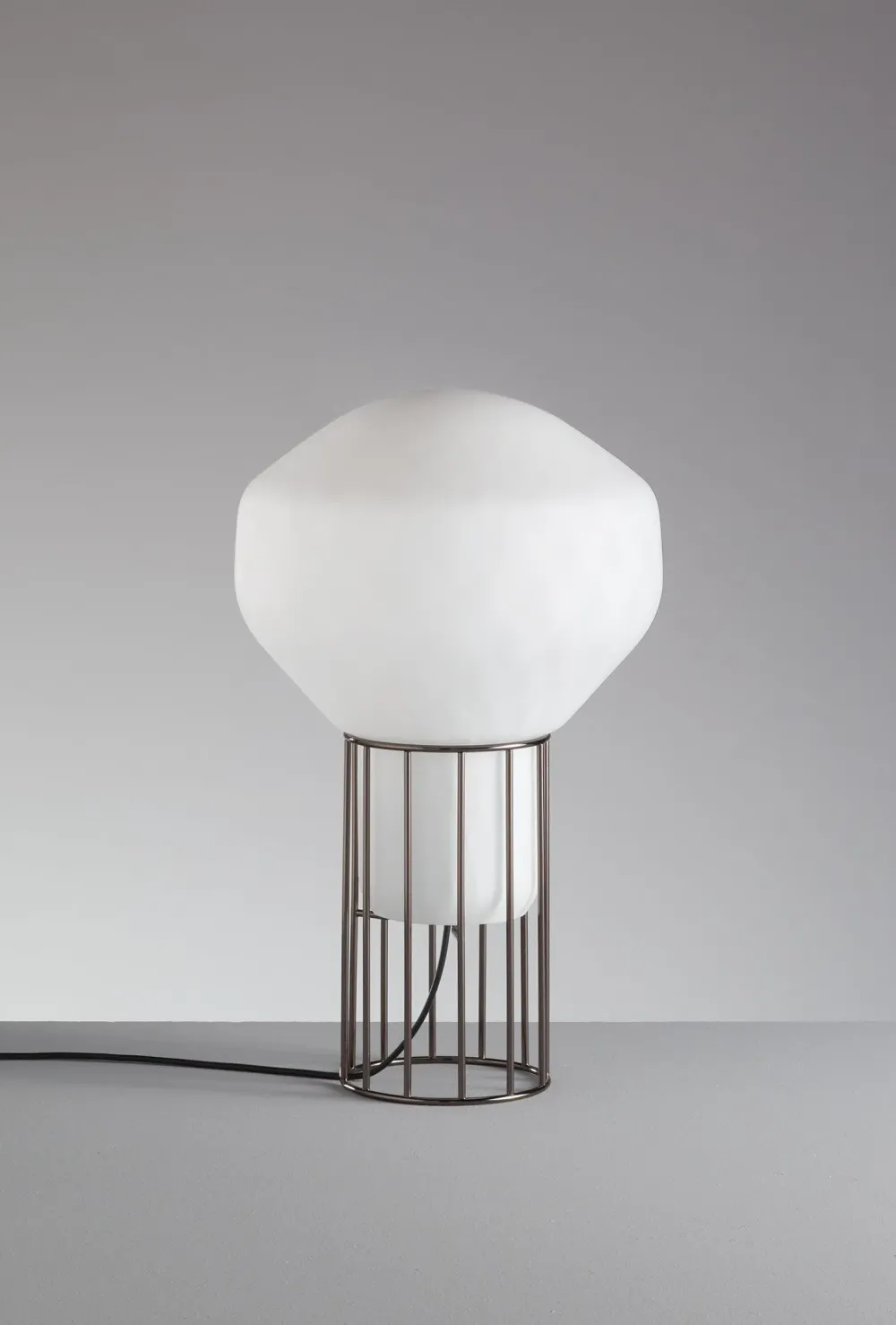 Aerostat di Fabbian è una lampada da tavolo moderna composta da un diffusore in vetro soffiato bianco lucido e un supporto metallico in cromo nero. La forma è semplice e tondeggiante. L elemento caratterizzante di questa lampada da tavolo è la gabbia metallica. Lampada di design Made in Italy.